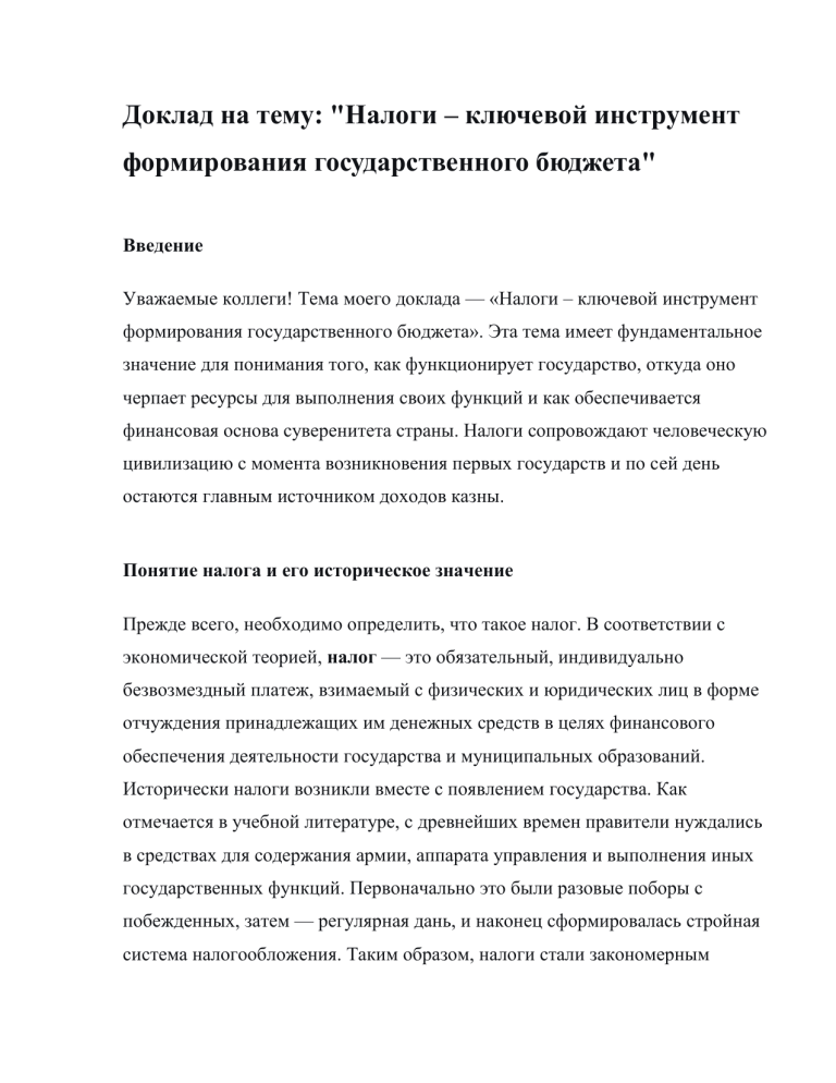 Доклад на тему: "Налоги – ключевой инструмент формирования государственного бюджета" Введение Уважаемые коллеги! Тема моего доклада — «Налоги – ключевой инструмент формирования государственного бюджета». Эта тема имеет фундаментальное значение для понимания того, как функционирует государство, откуда оно черпает ресурсы для выполнения своих функций и как обеспечивается финансовая основа суверенитета страны. Налоги сопровождают человеческую цивилизацию с момента возникновения первых государств и по сей день остаются главным источником доходов казны. Понятие налога и его историческое значение Прежде всего, необходимо определить, что такое налог. В соответствии с экономической теорией, налог — это обязательный, индивидуально безвозмездный платеж, взимаемый с физических и юридических лиц в форме отчуждения принадлежащих им денежных средств в целях финансового обеспечения деятельности государства и муниципальных образований. Исторически налоги возникли вместе с появлением государства. Как отмечается в учебной литературе, с древнейших времен правители нуждались в средствах для содержания армии, аппарата управления и выполнения иных государственных функций. Первоначально это были разовые поборы с побежденных, затем — регулярная дань, и наконец сформировалась стройная система налогообложения. Таким образом, налоги стали закономерным следствием появления государства и необходимым условием его существования. Налоги как основа доходной части бюджета В структуре доходов любого современного государства налоговые поступления занимают доминирующее положение. Бюджетная классификация выделяет пять групп доходов: налоговые доходы, неналоговые доходы, безвозмездные перечисления, доходы целевых бюджетных фондов и доходы от предпринимательской деятельности. При этом налоговые доходы составляют основу бюджета -7. Актуальные данные подтверждают этот тезис. За семь месяцев 2025 года в бюджетную систему Российской Федерации поступило 34,3 трлн рублей, что на 7% больше, чем за аналогичный период 2024 года. По федеральному бюджету рост составил 5%, при этом особо показателен рост ненефтегазовых доходов — 27% (плюс 2 трлн рублей) -2. Функции налогов Налоги как экономическая категория выполняют несколько важнейших функций, которые раскрывают их роль в формировании бюджета и регулировании экономики. Фискальная функция является главной и исторически первой. Она заключается в обеспечении финансирования государственных расходов, формировании доходной части бюджетов всех уровней. Именно благодаря фискальной функции создается материальная основа для существования государства и выполнения им своих обязательств перед обществом. Регулирующая функция проявляется в воздействии через систему налоговых ставок и льгот на экономические процессы. Государство может стимулировать или, напротив, сдерживать развитие определенных отраслей, влиять на инвестиционную активность и платежеспособный спрос. Контрольная функция позволяет отслеживать деятельность хозяйствующих субъектов, учитывать доходы граждан и оценивать эффективность самой налоговой системы. Социальная функция связана с перераспределением доходов в обществе через прогрессивное налогообложение и предоставление льгот социально уязвимым категориям граждан. Виды н