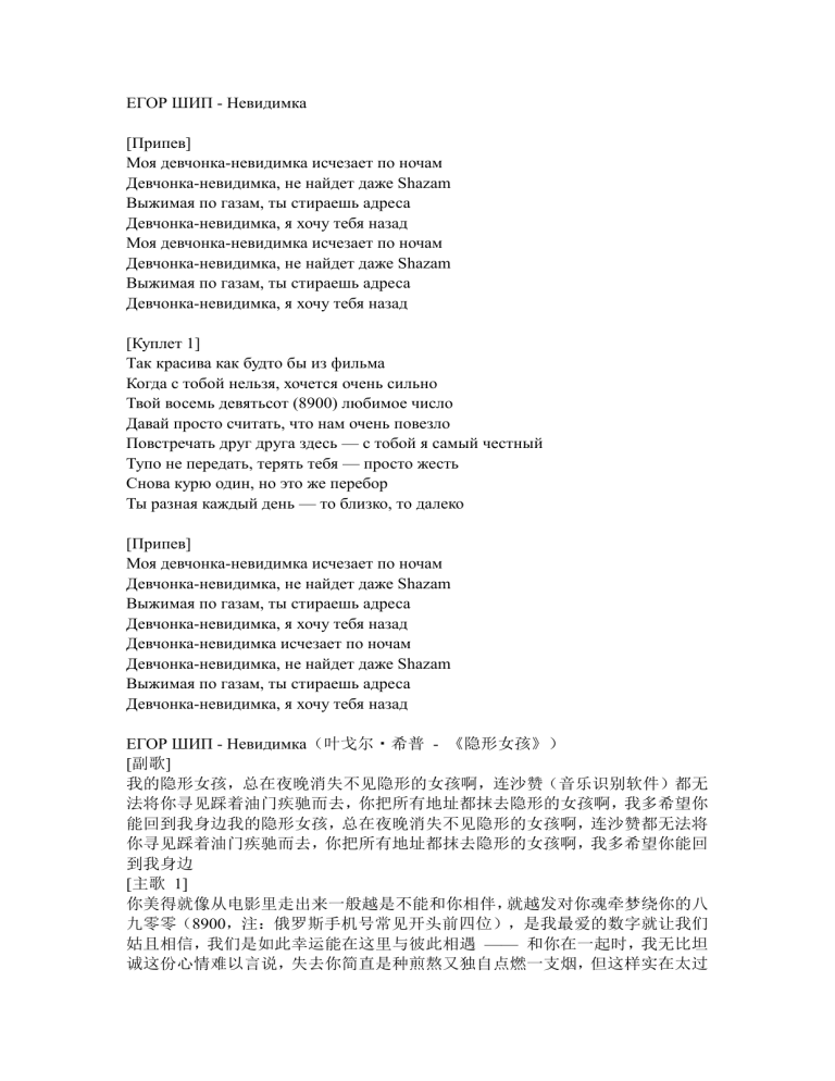 ЕГОР ШИП - Невидимка [Припев] Моя девчонка-невидимка исчезает по ночам Девчонка-невидимка, не найдет даже Shazam Выжимая по газам, ты стираешь адреса Девчонка-невидимка, я хочу тебя назад Моя девчонка-невидимка исчезает по ночам Девчонка-невидимка, не найдет даже Shazam Выжимая по газам, ты стираешь адреса Девчонка-невидимка, я хочу тебя назад [Куплет 1] Так красива как будто бы из фильма Когда с тобой нельзя, хочется очень сильно Твой восемь девятьсот (8900) любимое число Давай просто считать, что нам очень повезло Повстречать друг друга здесь — с тобой я самый честный Тупо не передать, терять тебя — просто жесть Снова курю один, но это же перебор Ты разная каждый день — то близко, то далеко [Припев] Моя девчонка-невидимка исчезает по ночам Девчонка-невидимка, не найдет даже Shazam Выжимая по газам, ты стираешь адреса Девчонка-невидимка, я хочу тебя назад Девчонка-невидимка исчезает по ночам Девчонка-невидимка, не найдет даже Shazam Выжимая по газам, ты стираешь адреса Девчонка-невидимка, я хочу тебя назад ЕГОР ШИП - Невидимка(叶戈尔・希普 - 《隐形女孩》) [副歌] 我的隐形女孩,总在夜晚消失不见隐形的女孩啊,连沙赞(音乐识别软件)都无 法将你寻见踩着油门疾驰而去,你把所有地址都抹去隐形的女孩啊,我多希望你 能回到我身边我的隐形女孩,总在夜晚消失不见隐形的女孩啊,连沙赞都无法将 你寻见踩着油门疾驰而去,你把所有地址都抹去隐形的女孩啊,我多希望你能回 到我身边 [主歌 1] 你美得就像从电影里走出来一般越是不能和你相伴,就越发对你魂牵梦绕你的八 九零零(8900,注:俄罗斯手机号常见开头前四位),是我最爱的数字就让我们 姑且相信,我们是如此幸运能在这里与彼此相遇 —— 和你在一起时,我无比坦 诚这份心情难以言说,失去你简直是种煎熬又独自点燃一支烟,但这样实在太过 火你每天都变幻莫测 —— 时而靠近,时而又遥远 Rauf & Faik - Море Мы осеннее солнце Мы ночная пора Мы? Ты столь же нежна Как синее море Сменяя штиль на бурю мятежную Равны ли сердца? Кто скажет мне солнце Двух разных людей И двух незнакомцев Как же ты мне дорога Останься со мной,я ветром твоим буду Наша дорога легка Скажи мне где реки Что живут внутри тебя? Летом иль зимою Не встретимся никак За светом иль тьмою? А в голове бардак Морской красотою Появишься во снах Возьмёшь за собою Никто нас не найдет Мы синее море (ай ай ай ай ай) Ай ай ай ай ай Ай ай ай ай ай Мы синее море (ай ай ай ай ай ) Ай ай ай ай ай Ай ай ай ай ай Как же ты мне дорога Останься со мной,я ветром твоим буду Наша дорога легка Скажи мне где реки Что живут внутри тебя? Летом иль зимою Не встретимся никак За светом иль тьмою? А в голове бардак Морской красотою Появишься во снах Возьмёшь за собою Никто нас не найдет Мы - синее море (ай ай ай ай ай ) Ай ай ай ай ай Ай ай ай ай ай Мы - синее море ай ай ай ай ай Ай ай ай ай ай Ай ай ай ай ай Мы - синее море (ай ай ай ай ай ) Ай ай ай ай ай Ай ай ай ай ай Мы - синее море (ай ай ай ай ай ) Ай ай ай ай ай Ай ай ай ай ай Как синее море…. МОТ - Перемены - это красиво [Текст песни «Перемены — это красиво»] [Интро] Там, а где-то там за стеной Мы оставим всё без грима [Куплет 1] Люди строили гримасы, а-а Их улыбки из пластмассы, м-м Слишком много суеты Слишком мало колорит Красота, она внутри, а не в аутфитах [Предприпев] Но им не понять нашей любви Эти петарды, что внутри Разрывают на части, смотри Напрасно пусть воет опасный Детроит Ведь я за тобою как никто [Припев] Там, а где-то там за стеной Мы оставим всё без грима Там, только бы до запятой Перемены — это красиво Там, та-да-да-да, та-да-да Там, та-да-да-да, та-да-да МОТ, Паша Левл - Снегопад (Премьера песни) Ты снегопад, и я снова простыл Пришла зима, и ты сожгла мосты Сл