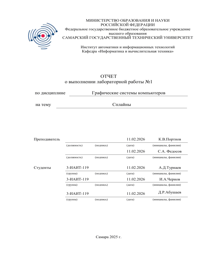 МИНИСТЕРСТВО ОБРАЗОВАНИЯ И НАУКИ РОССИЙСКОЙ ФЕДЕРАЦИИ Федеральное государственное бюджетное образовательное учреждение высшего образования САМАРСКИЙ ГОСУДАРСТВЕННЫЙ ТЕХНИЧЕСКИЙ УНИВЕРСИТЕТ Институт автоматики и информационных технологий Кафедра «Информатика и вычислительная техника» ОТЧЕТ о выполнении лабораторной работы №1 по дисциплине Графические системы компьютеров на тему Сплайны Преподаватель 11.02.2026 (должность) (подпись) (дата) 11.02.2026 (должность) Студенты (подпись) 3-ИАИТ-119 (группа) 11.02.2026 (подпись) 3-ИАИТ-119 (группа) (дата) 11.02.2026 (подпись) 3-ИАИТ-119 (группа) (дата) (дата) 11.02.2026 (подпись) Самара 2025 г. (дата) К.В.Портнов (инициалы, фамилия) С.А. Федосов (инициалы, фамилия) А.Д.Турнаев (инициалы, фамилия) И.А.Чернов (инициалы, фамилия) Д.Р.Абушаев (инициалы, фамилия) ЛАБОРАТОРНАЯ РАБОТА № 1 Цель работы - Получение практических навыков по программированию в Win32 API. 2
