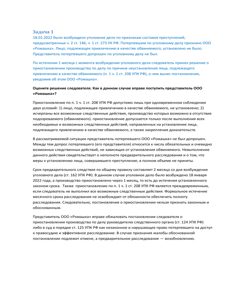 Задача 1 18.01.2022 было возбуждено уголовное дело по признакам составов преступлений, предусмотренных ч. 2 ст. 146, ч. 1 ст. 273 УК РФ. Потерпевшим по уголовному делу признано ООО «Ромашка». Лицо, подлежащее привлечению в качестве обвиняемого, установлено не было. Представитель потерпевшего допрошен по уголовному делу не был. По истечении 1 месяца с момента возбуждения уголовного дела следователь принял решение о приостановлении производства по делу по причине неустановления лица, подлежащего привлечению в качестве обвиняемого (п. 1 ч. 1 ст. 208 УПК РФ), о чем вынес постановление, уведомив об этом ООО «Ромашка». Оцените решение следователя. Как в данном случае вправе поступить представитель ООО «Ромашка»? Приостановление по п. 1 ч. 1 ст. 208 УПК РФ допустимо лишь при одновременном соблюдении двух условий: 1) лицо, подлежащее привлечению в качестве обвиняемого, не установлено; 2) исчерпаны все возможные следственные действия, производство которых возможно в отсутствие подозреваемого (обвиняемого). приостановление допускается только после выполнения всех необходимых и возможных следственных действий, направленных на установление лица, подлежащего привлечению в качестве обвиняемого, а также закрепления доказательств. В рассматриваемой ситуации представитель потерпевшего ООО «Ромашка» не был допрошен. Между тем допрос потерпевшего (его представителя) относится к числу обязательных и очевидно возможных следственных действий, не зависящих от установления обвиняемого. Невыполнение данного действия свидетельствует о неполноте предварительного расследования и о том, что меры к установлению лица, совершившего преступление, в полном объеме не приняты. Срок предварительного следствия по общему правилу составляет 2 месяца со дня возбуждения уголовного дела (ст. 162 УПК РФ). В данном случае уголовное дело было возбуждено 18 января 2022 года, а производство приостановлено через 1 месяц, то есть до истечения установленного законом срока. Также приостановление по п. 1 ч. 1 ст. 208 УПК РФ является преждевременным, если следователь не выполнил все возможные следственные действия. Формальное истечение месячного срока расследования не освобождает от обязанности обеспечить полноту расследования. Следовательно, постановление о приостановлении нельзя признать законным и обоснованным. Представитель ООО «Ромашка» вправе обжаловать постановление следователя о приостановлении производства по делу руководителю следственного органа (ст. 124 УПК РФ) либо в суд в порядке ст. 125 УПК РФ как незаконное и нарушающее право потерпевшего на доступ к правосудию и эффективное расследование. В случае признания жалобы обоснованной постановление подлежит отмене, а предварительное расследование — возобновлению. Задача 2 Обвиняемый Иванов И.И. через защитника предоставил следователю лист временной нетрудоспособности и справку из медицинского учреждения о том, что он болен ветряной оспой, карантин по данному заболеванию составляет 21 день. Следователь приостановил предварительное следствие по основанию, предусмотренному п. 4 ч. 1 ст. 208 УПК РФ. Потерпевшая, получившая уведомление о приостановлении, обжаловала его прокурору, указав: - основанием приостановления является временное тяжелое заболевание, подтвержденное медицинским заключением, однако ни того, ни другого у Иван