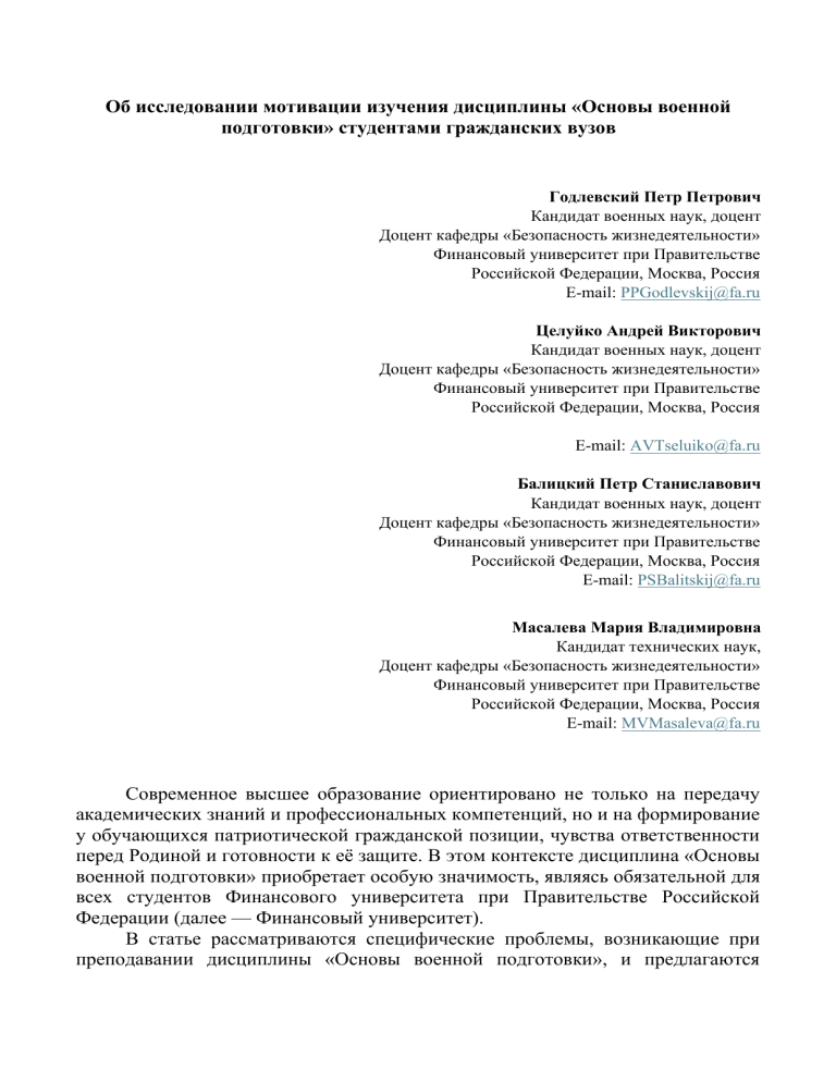 Об исследовании мотивации изучения дисциплины «Основы военной подготовки» студентами гражданских вузов Годлевский Петр Петрович Кандидат военных наук, доцент Доцент кафедры «Безопасность жизнедеятельности» Финансовый университет при Правительстве Российской Федерации, Москва, Россия E-mail: PPGodlevskij@fa.ru Целуйко Андрей Викторович Кандидат военных наук, доцент Доцент кафедры «Безопасность жизнедеятельности» Финансовый университет при Правительстве Российской Федерации, Москва, Россия E-mail: AVTseluiko@fa.ru Балицкий Петр Станиславович Кандидат военных наук, доцент Доцент кафедры «Безопасность жизнедеятельности» Финансовый университет при Правительстве Российской Федерации, Москва, Россия E-mail: PSBalitskij@fa.ru Масалева Мария Владимировна Кандидат технических наук, Доцент кафедры «Безопасность жизнедеятельности» Финансовый университет при Правительстве Российской Федерации, Москва, Россия E-mail: MVMasaleva@fa.ru Современное высшее образование ориентировано не только на передачу академических знаний и профессиональных компетенций, но и на формирование у обучающихся патриотической гражданской позиции, чувства ответственности перед Родиной и готовности к её защите. В этом контексте дисциплина «Основы военной подготовки» приобретает особую значимость, являясь обязательной для всех студентов Финансового университета при Правительстве Российской Федерации (далее — Финансовый университет). В статье рассматриваются специфические проблемы, возникающие при преподавании дисциплины «Основы военной подготовки», и предлагаются общие подходы к её эффективному освоению. Военная подготовка является неотъемлемым компонентом образовательной программы, направленным на формирование у студентов базовых знаний и навыков в области военнотактической подготовки, физической подготовки, а также дисциплины и организованности. Основная цель дисциплины «Основы военной подготовки» — сформировать у слушателей комплексное представление о российской военной доктрине, воспитать патриотические ценности и привить необходимые военные знания. Для повышения эффективности учебного процесса рекомендуется использовать методы активизации и индивидуализации обучения, что позволит обеспечить более глубокое усвоение материала и развитие необходимых компетенций у обучающихся. Практическая значимость статьи состоит в том, что ее результаты могут применять любые образовательных организаций высшего образования Российской Федерации в процессе реализации и корректировки государственной политики в области обороны. В процессе модернизации российского образования и в условиях роста актуальности вопросов государственной политики по воспитанию молодых людей с формированием у них чувства патриотизма желания отстаивать интересы своего Отечества, имеется ряд вызовов реализации образовательного модуля «Основы военной подготовки». Важным аспектом в изучении дисциплины «Основы военной подготовки» является наличие отношения мотивации у студентов. Отношение студентов к освоению дисциплины «Основы военной подготовки» является предметом обсуждения и исследования. Изучение отношения студентов университета представляет не только академический интерес, но и практическую значимость. Профессорско-преподавательским составом кафедры «Безопасность жизн