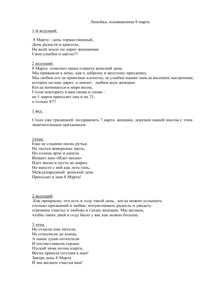 Линейка, посвященная 8 марта 1-й ведущий: 8 Марта - день торжественный, День радости и красоты, На всей земле он дарит женщинам Свои улыбки и цветы!!! 2 ведущий: 8 Марта отмечает наша планета женский день. Мы привыкли к нему, как к доброму и веселому празднику. Мы любим его за приятные хлопоты, за улыбки наших мам,за весеннее настроение, которое он нам дарит, а значит, любим всех женщин. Когда начинается в мире весна, Готов повторять я вам снова и снова не 1 марта приходит она и не 21, а только 8!!! 1 вед. Стало уже традицией поздравлять 7 марта женщин, девушек нашей школы с этим замечательным праздником. 1чтец. Еще не слышно песнь ручья, Не льется жаворонка трель, Но солнце ярче и капель Вещает нам:«Идет весна» Идет весна и пусть не жарко. Но вместе с ней как лета тень, Международный женский день Приходит к нам 8 Марта! 2 ведущий: Как прекрасно, что есть в году такой день, когда можно услышать столько признаний в любви, почувствовать радость и увидеть огромное счастье и любовь в глазах женщин. Мы желаем, чтобы таких дней в году было у вас как можно больше. 3 чтец. Не отмели еще метели, Не отшумели до конца, А наши души потеплели И посчастливели сердца. Пускай зима полна азарта, Весна пришла сегодня к нам! Завтра день 8 Марта И мы желаем счастья вам! 4 чтец Сегодня день такой, мы славим женщин, Да не коснётся вас беда, обиды, зло, Мы славим бабушек, нет лучше их, добрее, Во всём помогут и всегда умеют всё. Мы славим наших мам, спасибо вам! Любимым, любящим, не знающим покоя, Неутомимым, столько дел на них, Долготерпимым, к шалостям нестрогим, 5 чтец Мы славим девочек, прекраснее их нет, У них займёшь и ластик, и тетрадку, Шепнут в контрольной правильный ответ, Подскажут, как решается задачка. 6 чтец Мы славим женщин всех, спасибо вам, За красоту, за доброту и нежность. Вы помните - мы очень любим вас, И постараемся оправдывать надежды. Ведущий 1 В нашей школе учиться вас. Ученик 7 Я смотрю на вас, девчонки, И подснежник по весне, Ароматный, нежный, тонкий, Вспоминается вдруг мне. Сколько в нем благоуханья замечательных, озорных девчонок.Это поздравление для И сокрытого тепла, Сколько в вас очарованья Жизнь весенняя внесла! Ученик 8: Я смотрю на вас, девчонки, Слышу ваши голоса, Как они прекрасны, звонки, Лучезарные глаза. Все в них светится весною, Отражая небеса. Этой дивною порою В вас особая краса! Ведущий 1 С праздником женским, началом весны! С первой весенней проталинкой. Будьте здоровы и счастливы вы, Успехов больших вам и маленьких. Ведущий 2 Нам дарят знания и создают уют в школе 24 женщины. Для женщинучителей всегда находятся особые слова. В этот день примите от всех юношей и мужчин слова благодарности и признательности 8 лет мы с вами рядом. Вам, дорогие учителя, посвящаем эти строки. Ученик 9 Ученики красуются на партах, Детвора столпилась у доски. «Поздравляем с Днем 8 Марта!» Пишут на доске ученики. Постарались! Ни одной ошибки! Ведь не зря следило столько глаз, Как всегда приветливой улыбкой К ним вошла учительница в класс! Ученик 10 Велика учительницы радость, Вот она стоит перед доской. И следят ребяческие взгляды За ее приподнятой рукой. Хороши минуты были эти, Написала, улыбнулась вновь. Малыши прочли: "Спасибо, дети, за учебу вашу и любовь"! 11 чтец. Пусть женственность и красота С вами как можно больше будут, Ведь что для женщины года, Когда ее все ценят, любят. Желаем радости мы