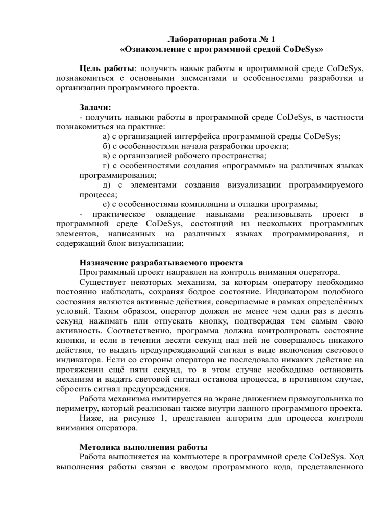 Лабораторная работа № 1 «Ознакомление с программной средой CoDeSys» Цель работы: получить навык работы в программной среде CoDeSys, познакомиться с основными элементами и особенностями разработки и организации программного проекта. Задачи: - получить навыки работы в программной среде CoDeSys, в частности познакомиться на практике: а) с организацией интерфейса программной среды CoDeSys; б) с особенностями начала разработки проекта; в) с организацией рабочего пространства; г) с особенностями создания «программы» на различных языках программирования; д) с элементами создания визуализации программируемого процесса; е) с особенностями компиляции и отладки программы; - практическое овладение навыками реализовывать проект в программной среде CoDeSys, состоящий из нескольких программных элементов, написанных на различных языках программирования, и содержащий блок визуализации; Назначение разрабатываемого проекта Программный проект направлен на контроль внимания оператора. Существует некоторых механизм, за которым оператору необходимо постоянно наблюдать, сохраняя бодрое состояние. Индикатором подобного состояния являются активные действия, совершаемые в рамках определённых условий. Таким образом, оператор должен не менее чем один раз в десять секунд нажимать или отпускать кнопку, подтверждая тем самым свою активность. Соответственно, программа должна контролировать состояние кнопки, и если в течении десяти секунд над ней не совершалось никакого действия, то выдать предупреждающий сигнал в виде включения светового индикатора. Если со стороны оператора не последовало никаких действие на протяжении ещё пяти секунд, то в этом случае необходимо остановить механизм и выдать световой сигнал останова процесса, в противном случае, сбросить сигнал предупреждения. Работа механизма имитируется на экране движением прямоугольника по периметру, который реализован также внутри данного программного проекта. Ниже, на рисунке 1, представлен алгоритм для процесса контроля внимания оператора. Методика выполнения работы Работа выполняется на компьютере в программной среде CoDeSys. Ход выполнения работы связан с вводом программного кода, представленного ниже, и выполнения действий по организации проекта. В начале создания проекта можно выбирать целевую систему «PLC 20001», для которой в дальнейшем будут разрабатываться программы. Важно, чтобы проект был выполнен самостоятельно, при использовании прилагающегося файла инструкций и справочной информации. Это будет способствовать более эффективному освоению принципов работы в CoDeSys. Однако, имеется готовый проект, которым можно воспользоваться в крайнем случае. Запуск CoDeSys CoDeSys запускается точно также как большинство Windows приложений: Пуск-> Программы-> 3S Software -> CoDeSys V2.3 -> CoDeSys V2.3 Пишем первую программу. Создаем новый проект, для этого необходимо воспользоваться командой File -> New. Настройка целевой платформы (Target Settings) Проект является машинно-независимым, его можно опробовать в режиме эмуляции. Но, лучше всего, сразу использовать платформу, которая будет применятся и далее – PLC 200-01, и подтвердите ввод – Ok. Главная программа PLC_PRG POU Следующее диалоговое окно определяет тип первого программного компонента (New POU). Выберете язык реализации (language for the POU) FBD и сохраните предложенные по умолчанию тип компонента – про