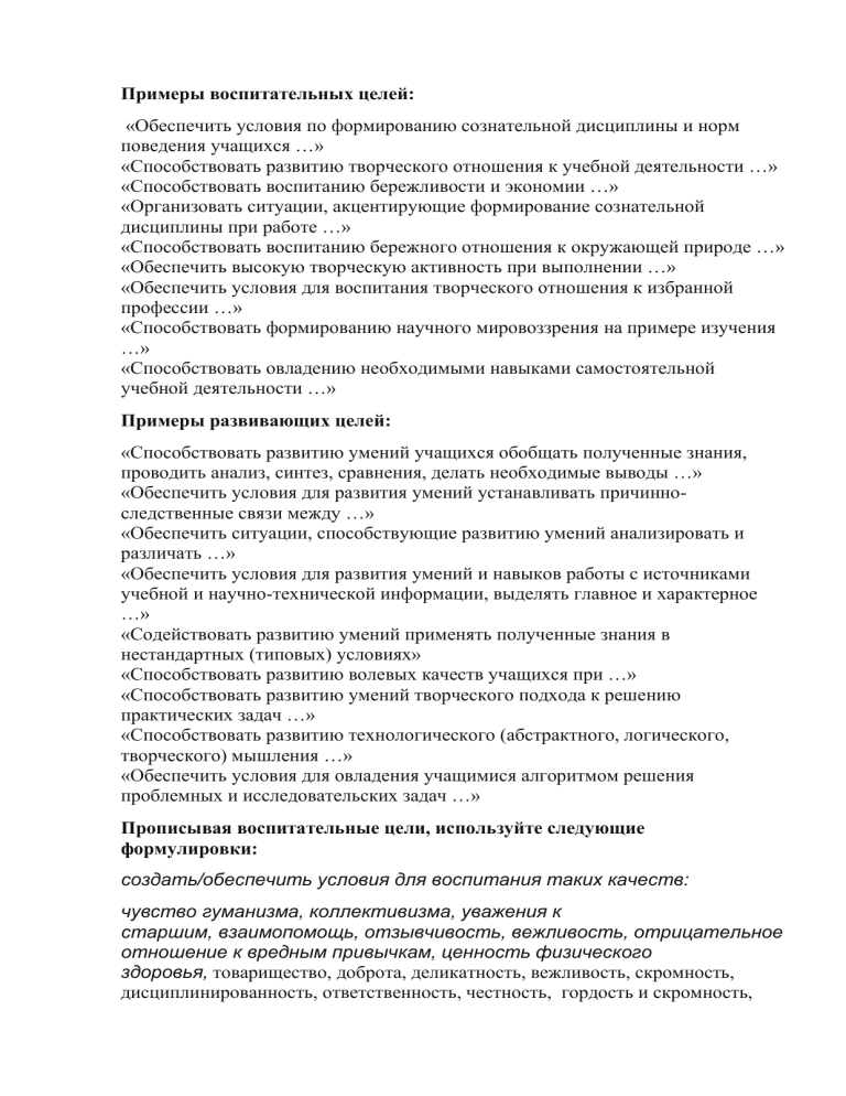 Примеры воспитательных целей: «Обеспечить условия по формированию сознательной дисциплины и норм поведения учащихся …» «Способствовать развитию творческого отношения к учебной деятельности …» «Способствовать воспитанию бережливости и экономии …» «Организовать ситуации, акцентирующие формирование сознательной дисциплины при работе …» «Способствовать воспитанию бережного отношения к окружающей природе …» «Обеспечить высокую творческую активность при выполнении …» «Обеспечить условия для воспитания творческого отношения к избранной профессии …» «Способствовать формированию научного мировоззрения на примере изучения …» «Способствовать овладению необходимыми навыками самостоятельной учебной деятельности …» Примеры развивающих целей: «Способствовать развитию умений учащихся обобщать полученные знания, проводить анализ, синтез, сравнения, делать необходимые выводы …» «Обеспечить условия для развития умений устанавливать причинноследственные связи между …» «Обеспечить ситуации, способствующие развитию умений анализировать и различать …» «Обеспечить условия для развития умений и навыков работы с источниками учебной и научно-технической информации, выделять главное и характерное …» «Содействовать развитию умений применять полученные знания в нестандартных (типовых) условиях» «Способствовать развитию волевых качеств учащихся при …» «Способствовать развитию умений творческого подхода к решению практических задач …» «Способствовать развитию технологического (абстрактного, логического, творческого) мышления …» «Обеспечить условия для овладения учащимися алгоритмом решения проблемных и исследовательских задач …» Прописывая воспитательные цели, используйте следующие формулировки: создать/обеспечить условия для воспитания таких качеств: чувство гуманизма, коллективизма, уважения к старшим, взаимопомощь, отзывчивость, вежливость, отрицательное отношение к вредным привычкам, ценность физического здоровья, товарищество, доброта, деликатность, вежливость, скромность, дисциплинированность, ответственность, честность, гордость и скромность, требовательность к себе, чувство собственного достоинства, дисциплинированность, аккуратность, добросовестность, чувство долга, трудолюбие, добросовестность, озабоченность неудачами товарищей, радость сопереживания их успехам, бережное отношение к имуществу школы и учебным пособиям, максимальная работоспособность на уроке, трудолюбие. Объектом, который как нравственная ценность постоянно присутствует на уроке, является Родина. Отношение к ней проявляется в добросовестности и ответственности, в чувстве гордости за ее успехи, в озабоченности ее трудностями, в желании достичь наивысших успехов в умственном развитии, чтобы принести ей пользу, в общем отношении к учению и своему учебному труду.