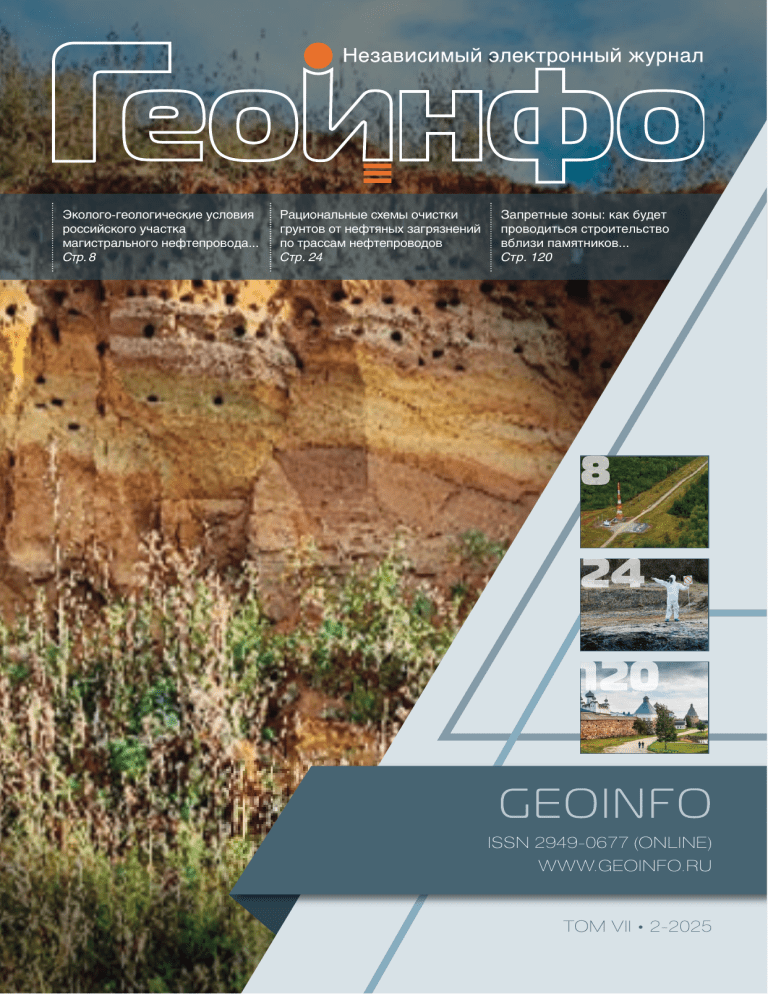 Эколого-геологические условия российского участка магистрального нефтепровода... Стр. 8 Рациональные схемы очистки грунтов от нефтяных загрязнений по трассам нефтепроводов Стр. 24 Запретные зоны: как будет проводиться строительство вблизи памятников... Стр. 120 ISSN 2949-0677 (ONLINE) WWW.GEOINFO.RU ТОМ VII • 2-2025 ЭКОЛОГИЧЕСКАЯ ГЕОЛОГИЯ DOI:10.58339/2949-0677-2025-7-2-6-23 ГРИГОРЬЕВА И.Ю. Доцент кафедры инженерной и экологической геологии МГУ имени М.В. Ломоносова, к. г.-м. н., г. Москва, г. Москва, Россия ikagrig@inbox.ru КОРОЛЁВ В.А. Профессор кафедры инженерной и экологической геологии геологического факультета МГУ имени М.В. Ломоносова, д. г.-м. н., г. Москва, Россия va-korolev@bk.ru САМАРИН Е.Н. Профессор кафедры инженерной и экологической геологии геологического факультета МГУ имени М.В. Ломоносова, д. г.-м. н., г. Москва, Россия samarinen@mail.ru НИКОЛАЕВА С.К. Доцент кафедры инженерной и экологической геологии геологического факультета МГУ имени М.В. Ломоносова, к. г.-м. н, г. Москва, Россия nikolaeva sk@gmail.com ЧЖАН Цз. Профессор Северо-Восточного университета лесного хозяйства, к. г.-м. н., г. Харбин, Китай zez@nefu.edu.cn ЧЖАН Ш. Доцент Северо-Восточного университета лесного хозяйства, к. г.-м. н., г. Харбин, Китай zhangshengrong1988@nefu.edu.cn 6 «ГеоИнфо» | 2­2025 УДК 55; 504 ЭКОЛОГО-ГЕОЛОГИЧЕСКИЕ УСЛОВИЯ РОССИЙСКОГО УЧАСТКА МАГИСТРАЛЬНОГО НЕФТЕПРОВОДА СКОВОРОДИНО – МОХЭ (РФ – КНР) Принята к публикации 25.04.2025 Опубликована 18.08.2025 АННОТАЦИЯ В статье рассмотрены существующие на сегодняшний день подходы к выделению компонентов эколого-геологических условий. На основе учения об экологических функциях литосферы дана характеристика эколого-ресурсных, эколого-геодинамических, эколого-геохимических и эколого-геофизических условий российского участка магистрального нефтепровода Сковородино – Мохэ (Россия – Китай). Представленные подходы к характеристике эколого-геологических условий могут быть востребованны как при проведении инженерно-экологических изысканий, так и при оценке воздействия на компоненты окружающей среды при решении аналогичных задач на территориях России и Китайской Народной Республики. КЛЮЧЕВЫЕ СЛОВА: эколого-геологические условия; компоненты эколого-геологических условий; эколого-ресурсные условия; эколого-геодинамические условия; эколого-геохимические условия; эколого-геофизические условия; трасса нефтепровода; Сковородинский район. ССЫЛКА ДЛЯ ЦИТИРОВАНИЯ: Григорьева И.Ю., Королев В.А., Самарин Е.Н., Николаева С.К., Чжан Цз., Чжан Ш. Эколого-геологические условия российского участка магистрального нефтепровода Сковородино – Мохэ (РФ – КНР) // ГеоИнфо. 2025. Т. 7. № 2. С. 6–23. DOI:10.58339/2949-0677-2025-7-2-6-23. ECOLOGICAL GEOLOGY ECO-GEOLOGICAL CONDITIONS OF THE RUSSIAN SECTION OF THE MAIN OIL PIPELINE SKOVORODINO-MOHE (RUSSIA-CHINA) Accepted for publication 25.04.2025 Published 18.08.2025 GRIGOR'EVA I.Yu. PhD, assistant professor, Department of Engineering and Ecological Geology, Faculty of Geology, Lomonosov Moscow State University, Moscow, Russia ikagrig@inbox.ru NIKOLAEVA S.K. PhD, assistant professor, Department of Engineering and Ecological Geology, Faculty of Geology, Lomonosov Moscow State University, Moscow, Russia nikolaeva sk@gmail.com KOROLEV V.A. * DSc, professor, Department of Engineering and Ecological Geology, Faculty of Geology, Lomonosov Moscow State University, Moscow, Russia va-korolev@bk.ru ZHANG J. PhD, professor, Northeast Forestry University, Harbin, China zez@nefu.edu.cn SAMARIN E.N. DSc, professor, Department of Engineering and Ecological Geology, Faculty of Geology, Lomonosov Moscow State University, Moscow, Russia samarinen@mail.ru ZHANG Sh. PhD, assistant professor, Northeast Forestry University, Harbin, China zhangshengrong1988@nefu.edu.cn ABSTRACT The article considers the currently existing approaches to identifying the components of eco-geological conditions. Based on the doctrine of the ecological functions of the lithosphere, the characteristics of the ecoresource, eco-geodynamic, eco-