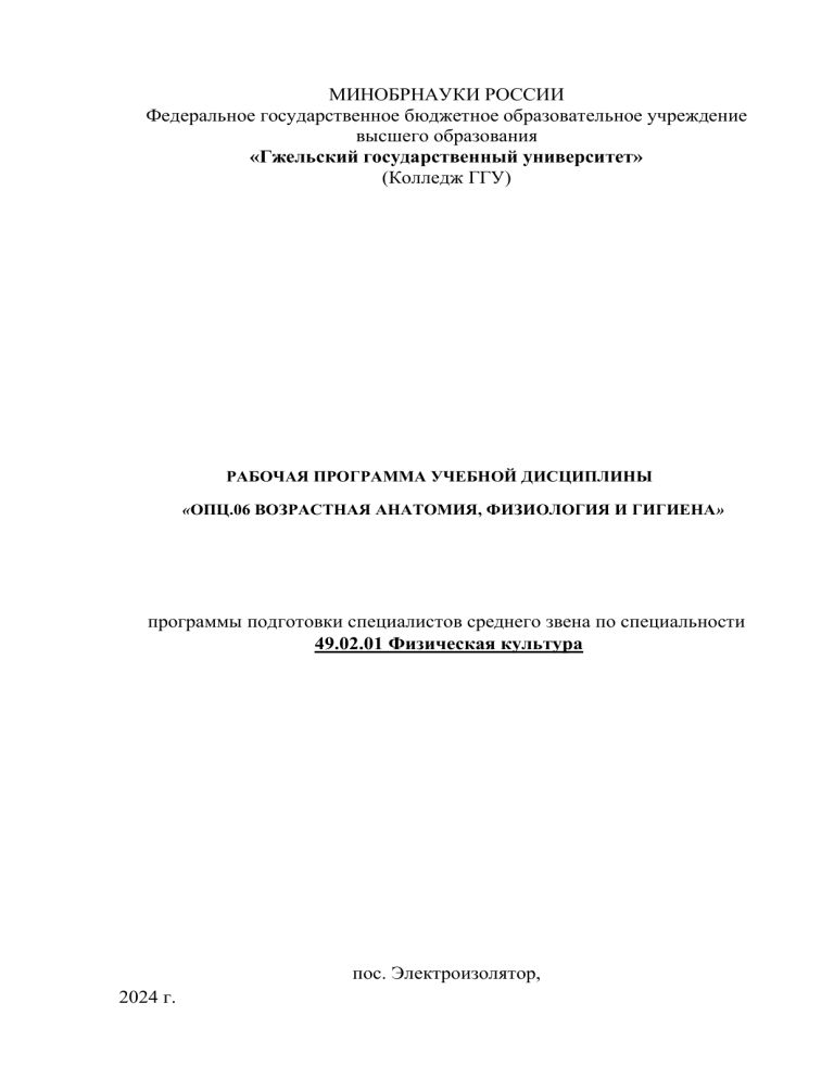 МИНОБРНАУКИ РОССИИ Федеральное государственное бюджетное образовательное учреждение высшего образования «Гжельский государственный университет» (Колледж ГГУ) РАБОЧАЯ ПРОГРАММА УЧЕБНОЙ ДИСЦИПЛИНЫ «ОПЦ.06 ВОЗРАСТНАЯ АНАТОМИЯ, ФИЗИОЛОГИЯ И ГИГИЕНА» программы подготовки специалистов среднего звена по специальности 49.02.01 Физическая культура пос. Электроизолятор, 2024 г. СОДЕРЖАНИЕ 1. ОБЩАЯ ХАРАКТЕРИСТИКА РАБОЧЕЙ ПРОГРАММЫ УЧЕБНОЙ ДИСЦИПЛИНЫ 2. СТРУКТУРА И СОДЕРЖАНИЕ УЧЕБНОЙ ДИСЦИПЛИНЫ 3. УСЛОВИЯ РЕАЛИЗАЦИИ УЧЕБНОЙ ДИСЦИПЛИНЫ 4. КОНТРОЛЬ И ОЦЕНКА РЕЗУЛЬТАТОВ ОСВОЕНИЯ УЧЕБНОЙ ДИСЦИПЛИНЫ 1. ОБЩАЯ ХАРАКТЕРИСТИКА РАБОЧЕЙ ПРОГРАММЫ УЧЕБНОЙ ДИСЦИПЛИНЫ «ОПЦ.06 Возрастная анатомия, физиология и гигиена» 1.1. Место дисциплины в структуре основной образовательной программы: Учебная дисциплина «ОПЦ.06 Возрастная анатомия, физиология и гигиена» является обязательной частью общепрофессионального цикла образовательной программы в соответствии с ФГОС СПО по специальности 49.02.01 Физическая культура. Особое значение дисциплина имеет при формировании и развитии ОК 01; ОК 02; ОК 08. 1.2. Цель и планируемые результаты освоения дисциплины: В рамках программы учебной дисциплины обучающимися осваиваются умения и знания Код Умения Знания ПК, ОК ОК 01 ОК 02 ОК 08 использовать приобретенные знания, умения и навыки при организации учебных занятий и мероприятий; определять критерии готовности детей к систематическому обучению в образовательной организации; давать гигиеническую оценку окружающей ребенка среды, режима работы образовательной организации, расписания занятий, организации и проведения занятий и мероприятий в образовательных организациях; определять физическую и умственную работоспособность; проводить диагностику наступающего утомления; проводить мероприятия, направленные на поддержание высокой работоспособности при различных видах деятельности. общие закономерности роста и развития организма детей и подростков; физиологию ЦНС и ВНД детей и подростков; рефлекторный характер речевой функции; методы определения физического развития и физической работоспособности детей; методы изучения умственной работоспособности детей; динамический стереотип и его значение в обучении и воспитании школьника; возрастные особенности функционирования висцеральных систем; биологическую природу и целостность организма человека, как саморегулирующейся системы; принципы и механизмы регуляции основных жизненных функций и систем обеспечения гомеостаза; методы гигиенической оценки окружающей ребенка среды; гигиенические основы организации режима дня, учебновоспитательного процесса. 2. СТРУКТУРА И СОДЕРЖАНИЕ УЧЕБНОЙ ДИСЦИПЛИНЫ 2.1. Объем учебной дисциплины и виды учебной работы Вид учебной работы Объем образовательной программы учебной дисциплины Обязательная аудиторная нагрузка (всего) в т.ч. теоретическое обучение практические занятия Самостоятельная работа Промежуточная аттестация в форме дифференцированного зачета Объем в часах 199 192 112 80 7 2.2. Тематический план и содержание учебной дисциплины Наименование разделов и тем 1 Тема 1. Введение в возрастную анатомию, физиологию и гигиену человека. Тема 2. Общие вопросы возрастной анатомии, физиологии и гигиены Тема 3. Регуляторные системы организма Содержание учебного материала и формы организац