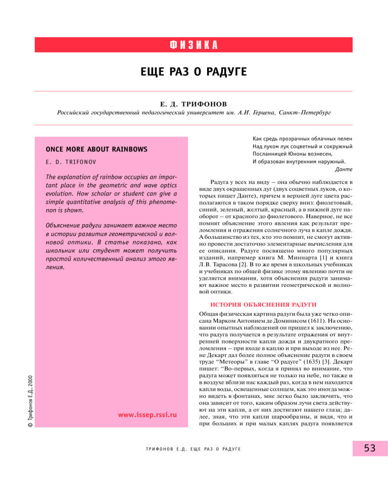 ФИЗИКА ЕЩЕ РАЗ О РАДУГЕ Е. Д. ТРИФОНОВ Российский государственный педагогический университет им. А.И. Герцена, Санкт-Петербург Как средь прозрачных облачных пелен Над луком лук соцветный и сокружный Посланницей Юноны вознесен, И образован внутренним наружный. Данте ONCE MORE ABOUT RAINBOWS E. D. TRIFONOV The explanation of rainbow occupies an important place in the geometric and wave optics evolution. How scholar or student can give a simple quantitative analysis of this phenomenon is shown. Объяснение радуги занимает важное место в истории развития геометрической и волновой оптики. В статье показано, как школьник или студент может получить простой количественный анализ этого явления. Радуга у всех на виду – она обычно наблюдается в виде двух окрашенных дуг (двух соцветных луков, о которых пишет Данте), причем в верхней дуге цвета располагаются в таком порядке сверху вниз: фиолетовый, синий, зеленый, желтый, красный, а в нижней дуге наоборот – от красного до фиолетового. Наверное, не все помнят объяснение этого явления как результат преломления и отражения солнечного луча в капле дождя. А большинство из тех, кто это помнит, не смогут активно провести достаточно элементарные вычисления для ее описания. Радуге посвящено много популярных изданий, например книга М. Миннарта [1] и книга Л.В. Тарасова [2]. В то же время в школьных учебниках и учебниках по общей физике этому явлению почти не уделяется внимания, хотя объяснения радуги занимают важное место в развитии геометрической и волновой оптики. © Трифонов Е.Д., 2000 ИСТОРИЯ ОБЪЯСНЕНИЯ РАДУГИ www.issep.rssi.ru Общая физическая картина радуги была уже четко описана Марком Антонием де Доминисом (1611). На основании опытных наблюдений он пришел к заключению, что радуга получается в результате отражения от внутренней поверхности капли дождя и двукратного преломления – при входе в каплю и при выходе из нее. Рене Декарт дал более полное объяснение радуги в своем труде “Метеоры” в главе “О радуге” (1635) [3]. Декарт пишет: “Во-первых, когда я принял во внимание, что радуга может появляться не только на небе, но также и в воздухе вблизи нас каждый раз, когда в нем находятся капли воды, освещенные солнцем, как это иногда можно видеть в фонтанах, мне легко было заключить, что она зависит от того, каким образом лучи света действуют на эти капли, а от них достигают нашего глаза; далее, зная, что эти капли шарообразны, и видя, что и при больших и при малых каплях радуга появляется Т Р И Ф О Н О В Е . Д . Е Щ Е РА З О РА Д У Г Е 53 ФИЗИКА всегда одинаковым образом, я поставил себе целью создать очень большую каплю, чтобы иметь возможность лучше ее рассмотреть. Для этого я наполнил водой большой стеклянный сосуд, вполне круглый и вполне прозрачный и пришел к следующему выводу…” Этот вывод повторяет и уточняет результат, полученный Доминисом. В частности, Декарт обнаружил, что вторая (внешняя) радуга возникает в результате двух преломлений и двух отражений. Он также качественно объяснил появление цветов радуги, сравнивая преломление света в капле с преломлением в стеклянной призме. Рисунок 1, поясняющий ход лучей в капле, взят из упомянутой выше работы Декарта. Но главная заслуга Декарта заключалась в том, что он количественно объяснил это явление, впервые используя закон преломления света: “Я еще не знал, почему цвета появляются лишь под известными углами, пока не взял перо и не вычислил подробно хода всех лучей, которые пада
