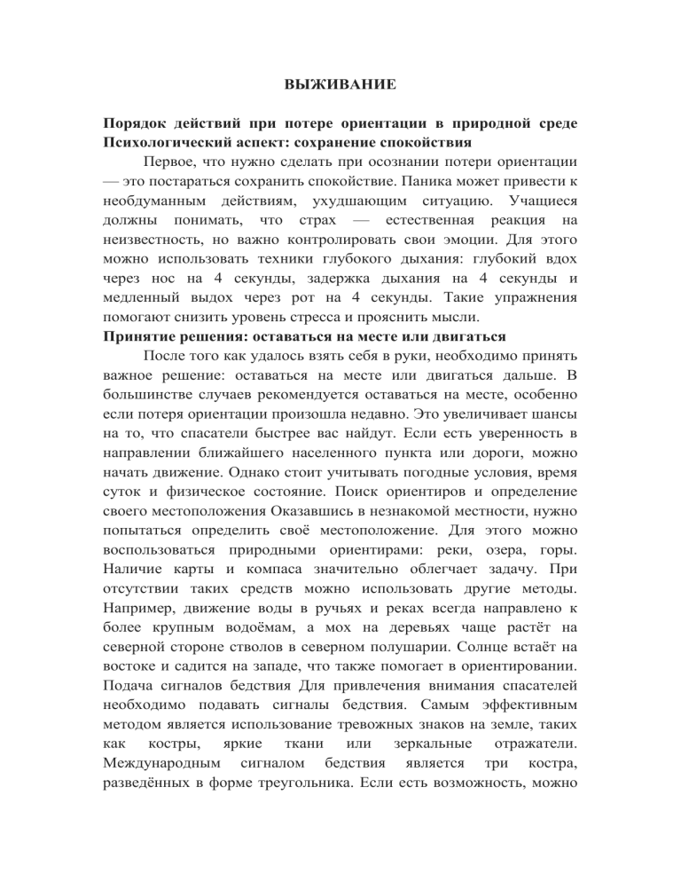 ВЫЖИВАНИЕ Порядок действий при потере ориентации в природной среде Психологический аспект: сохранение спокойствия Первое, что нужно сделать при осознании потери ориентации — это постараться сохранить спокойствие. Паника может привести к необдуманным действиям, ухудшающим ситуацию. Учащиеся должны понимать, что страх — естественная реакция на неизвестность, но важно контролировать свои эмоции. Для этого можно использовать техники глубокого дыхания: глубокий вдох через нос на 4 секунды, задержка дыхания на 4 секунды и медленный выдох через рот на 4 секунды. Такие упражнения помогают снизить уровень стресса и прояснить мысли. Принятие решения: оставаться на месте или двигаться После того как удалось взять себя в руки, необходимо принять важное решение: оставаться на месте или двигаться дальше. В большинстве случаев рекомендуется оставаться на месте, особенно если потеря ориентации произошла недавно. Это увеличивает шансы на то, что спасатели быстрее вас найдут. Если есть уверенность в направлении ближайшего населенного пункта или дороги, можно начать движение. Однако стоит учитывать погодные условия, время суток и физическое состояние. Поиск ориентиров и определение своего местоположения Оказавшись в незнакомой местности, нужно попытаться определить своѐ местоположение. Для этого можно воспользоваться природными ориентирами: реки, озера, горы. Наличие карты и компаса значительно облегчает задачу. При отсутствии таких средств можно использовать другие методы. Например, движение воды в ручьях и реках всегда направлено к более крупным водоѐмам, а мох на деревьях чаще растѐт на северной стороне стволов в северном полушарии. Солнце встаѐт на востоке и садится на западе, что также помогает в ориентировании. Подача сигналов бедствия Для привлечения внимания спасателей необходимо подавать сигналы бедствия. Самым эффективным методом является использование тревожных знаков на земле, таких как костры, яркие ткани или зеркальные отражатели. Международным сигналом бедствия является три костра, разведѐнных в форме треугольника. Если есть возможность, можно применять свисток или подачу звуковых сообщений(например, три коротких свистка или крика). Условные знаки могут быть поданы также и визуально: зеркальный отражатель (гелиограф), мигание фонариком ночью и другие методы. Рациональное использование ресурсов В условиях автономного выживания крайне необходимо рационально использовать имеющиеся резервы. Это касается не только пищи и воды, но и энергии. Воду нужно экономить, искать дополнительные источники и обеззараживать еѐ перед употреблением. Пищу следует употреблять небольшими порциями, чтобы она дольше сохранялась. Энергия тела должна быть также расходована обоснованно: избегайте излишних движений, если это не требуется, и поддерживайте оптимальную температуру тела. Организация укрытия и забота о себе в эти моменты также входят в необходимое использование ресурсов. Наличие укрытия поможет сохранить тепло, а правильное питание и достаточное количество воды позволят поддерживать силы до прибытия помощи. Умение делать импровизированные средства защиты, такие как укрытие от солнца или дождя, также является частью эффективного использования ресурсов. Таким образом, вы должны понять, что при потере ориентации в п