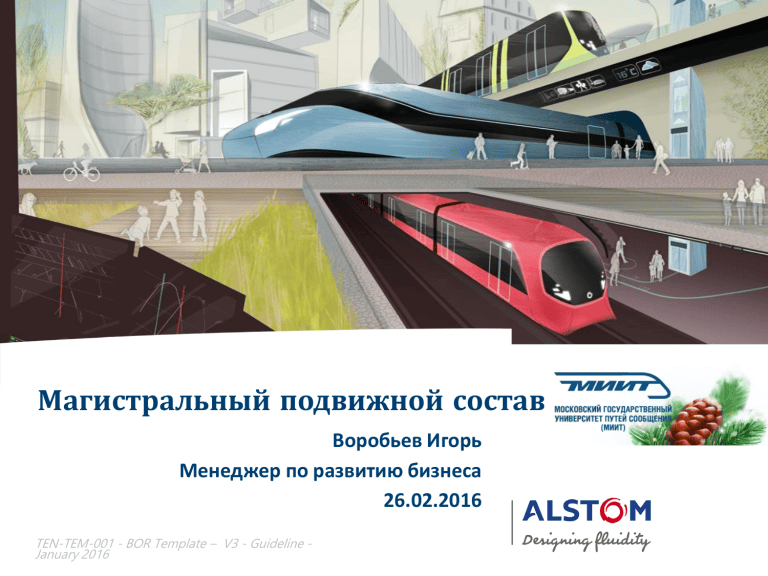 Магистральный подвижной состав Воробьев Игорь Менеджер по развитию бизнеса 26.02.2016 TEN-TEM-001 - BOR Template – V3 - Guideline January 2016 СОДЕРЖАНИЕ Магистральные электровозы 3 Маневровые локомотивы 18 Силовая электроника 21 Пригородные поезда 27 Альтернативные источники энергии 37 Вопросы и ответы 49 © ALSTOM 2015. All rights reserved. Information contained in this document is indicative only. No representation or warranty is given or should be relied on that it is complete or correct or will apply to any particular project. This will depend on the technical and commercial circumstances. It is provided without liability and is subject to change without notice. Reproduction, use or disclosure to third parties, without express written authority, is strictly prohibited. Магистральные электровозы TEN-TEM-001 - BOR Template – V3 - Guideline January 2016 Рынок грузовых электровозов и их сегментация Тепловозы Электровозы 2000 1800 1600 1400 1200 1000 800 600 400 200 0 Среднегодовой объем рынка (m€) доступные сегменты рынка 2014-16гг. Мощность на валах двигателей (кВт) Маневровые 10 000 ЭГрузовые Высокоск оростной 8 000 7 000 6 400 VHST Грузовой ДГрузов ой 4 000 Пассажирский ЭМного Целево й Электровоз Д-Многоцелевой 2 000 1 600 600 Тепловоз Маневро вый Маневровый 120 140 200 250 320 Максимальная рабочая скорость (км/ч) © ALSTOM 2015. All rights reserved. Information contained in this document is indicative only. No representation or warranty is given or should be relied on that it is complete or correct or will apply to any particular project. This will depend on the technical and commercial circumstances. It is provided without liability and is subject to change without notice. Reproduction, use or disclosure to third parties, without express written authority, is strictly prohibited. Обозначения электровозов Prima - Alstom Линии/Инфра Требования заказчика Решения Alstom Назначение Электровоз Грузово й Тепловоз Пассажир ский Грузовой Многоцелевой Пассажирский Маневровый Магистрал ьный Необходимо поставить Высокос коростно й 697 восьмиосные 174x2 KZ8A 50x2 AZ8A восьмиосные 1230+200 0 Грузовы е 800x2 India шестиосные 181 500 195x2 2ЭС5 ТМХ 200 шестиосные 3 H3 30 Многоце левые 47 H4 четырехосные 292 0 322 К поставке (200 Вт Siemens) Электровоз Маневровые промышлен ные 162 четырехосные трехосные 47 Тепловоз 205 Необходимо поставить 92 KZ4AT 148 EP20 ТМХ Кол-во электровозов с начала производства PRIMA в 2000г. + все скоростные электровозы TGV © ALSTOM 2015. All rights reserved. Information contained in this document is indicative only. No representation or warranty is given or should be relied on that it is complete or correct or will apply to any particular project. This will depend on the technical and commercial circumstances. It is provided without liability and is subject to change without notice. Reproduction, use or disclosure to third parties, without express written authority, is strictly prohibited. (-> Vossloh) 12 Маневровый Электровоз Prima - Многоцелевой • • • • • Грузовой или пассажирский до 200 км/ч Мощность до 6 400 кВт 4 напряжения: 1,5 кВ DC+ 3кВ DC + 15кВ AC + 25кВ AC Различные системы безопасности для европейских грузовых коридоров Грузовой вариант сертифицирован во ФРАНЦИИ и ГЕРМАНИИ до 120 км/ч RFP Submittal Контракты выигрываются с 2000г. ONCF, 25 • • • • MRCE, 50 ÖBB, 200 358 Electric PRIMA MP (Колея МСЖД) AKIEM, 47 (итого: 107) Q3 Q4 2015г. Prima Fret 240 Prima Ile de France 67 Prima Veolia/Europorte 31 Prima II Morocco 20 Q1 Q2 Q3 Q4 Q1 2016г. © ALSTOM 2015. All rights reserved. Information contained in this document is indicative only. No representation or warranty is given or should be relied on that it is complete or correct or will apply to any particular project. This will depend on the technical and commercial circumstances. It is provided without liability and is subject to change without notice. Reproduction, use or disclosure to third parties, without express written authority, is strictly prohibited. Q2 2017г. Электровозы Prima Индия Грузовые Возможность снижения стоимости Разработка “Четко адаптированного” локомотива в портфолио Alstom Размещение и укрепление новой панели поставщиков и производителей компонентов с низкой стоимостью производства, которые могли бы использоваться для снижения стоимости электровозов Prima • Knorr Bremse • ABB • … адаптация в Индии Размещение конструкторского и производственного отдела в Бангало