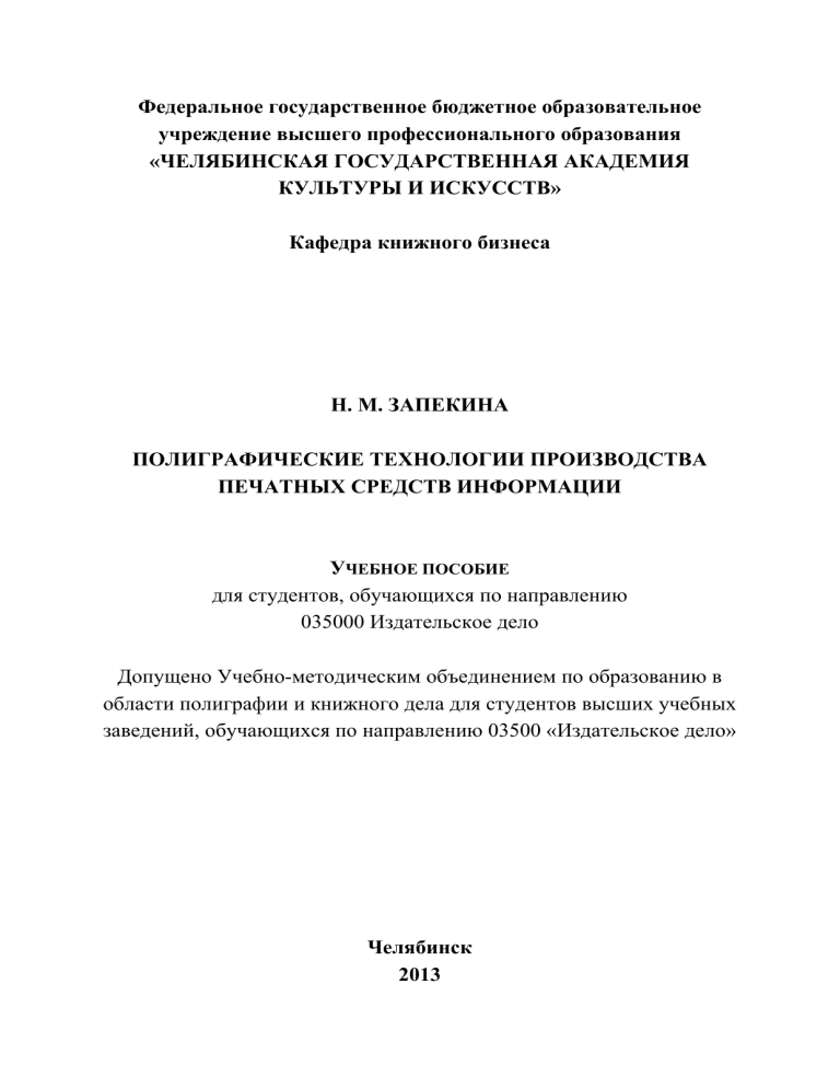 Федеральное государственное бюджетное образовательное учреждение высшего профессионального образования «ЧЕЛЯБИНСКАЯ ГОСУДАРСТВЕННАЯ АКАДЕМИЯ КУЛЬТУРЫ И ИСКУССТВ» Кафедра книжного бизнеса Н. М. ЗАПЕКИНА ПОЛИГРАФИЧЕСКИЕ ТЕХНОЛОГИИ ПРОИЗВОДСТВА ПЕЧАТНЫХ СРЕДСТВ ИНФОРМАЦИИ УЧЕБНОЕ ПОСОБИЕ для студентов, обучающихся по направлению 035000 Издательское дело Допущено Учебно-методическим объединением по образованию в области полиграфии и книжного дела для студентов высших учебных заведений, обучающихся по направлению 03500 «Издательское дело» Челябинск 2013 УДК 655.5(075.8) ББК 76.17я73 З-31 Утверждено на заседании кафедры книжного бизнеса 31 августа 2011 г., протокол № 1. З-31 Запекина, Н. М. Полиграфические технологии производства печатных средств информации : учеб. пособие / Челяб. гос. акад. культуры и искусств; Н. М. Запекина. – Челябинск, 2013. – 206 с. ISBN 978-5-94839-331-5 В пособии рассматриваются классические и современные разновидности печатных процессов, особенности допечатной подготовки и послепечатной обработки полиграфической продукции. Издание снабжено списками рекомендуемой литературы, вопросами для повторения и закрепления материала. Рецензенты: Т. Д. Рубанова, доктор педагогических наук, профессор кафедры книжно- го бизнеса Челябинской государственной академии культуры и искусств; О. А. Калегина, доктор педагогических наук, профессор кафедры библиотечно-информационной деятельности Казанского государственного университета культуры и искусств; А. Р. Абдулхакова, кандидат филологических наук, заведующая кафедрой книговедения и библиографии Казанского государственного университета культуры и искусств. Печатается по решению редакционно-издательского совета ISBN 978-5-94839-331-5 © Запекина Н. М., 2013 © Челябинская государственная академия культуры и искусств, 2013 ОГЛАВЛЕНИЕ ПРЕДИСЛОВИЕ ............................................................................................... 5 РАЗДЕЛ I. ПРЕСС............................................................................................. 7 ГЛАВА 1. КЛАССИЧЕСКИЕ И СОВРЕМЕННЫЕ СПОСОБЫ ПЕЧАТИ............................................................................................ 7 1.1. Высокая печать и ее разновидности ................................................. 7 1.2. Глубокая печать и ее разновидности ............................................. 10 1.3. Плоская печать и ее разновидности ............................................... 12 1.4. Специальные виды печати ................................................................. 14 1.5. Новейшие полиграфические технологии ..................................... 20 1.6. Цифровая печать.................................................................................... 25 1.7. Виды печатных машин ........................................................................ 28 ГЛАВА 2. ТОНО И ЦВЕТОВОСПРОИЗВЕДЕНИЕ В ПОЛИГРАФИИ ............................................................................. 33 2.1. История воспроизведения полутоновых изображений ........... 33 2.2. Растрирование ........................................................................................ 37 2.3. Воспроизведение полноцветных изображений .......................... 41 2.4. Цветовые системы и технологии, форматы хранения изобразительной информации ........................................................... 46 РАЗДЕЛ II. ОСНОВНЫЕ РАСХОДНЫЕ МАТЕРИАЛЫ ПОЛИГРАФИЧЕСКОГО ПРОИЗВОДСТВА .......................... 53 ГЛАВА 3. БУМАГА И КАРТОН........................................................ 53 3.1. История возникновения бумажного производства ................... 53 3.2. Современная технология изготовления бумаги ......................... 58 3.3. Устройство бумагоделательной машины ..................................... 64 3.4. Свойства бумаги .................................................................................... 67 3.5. Вид