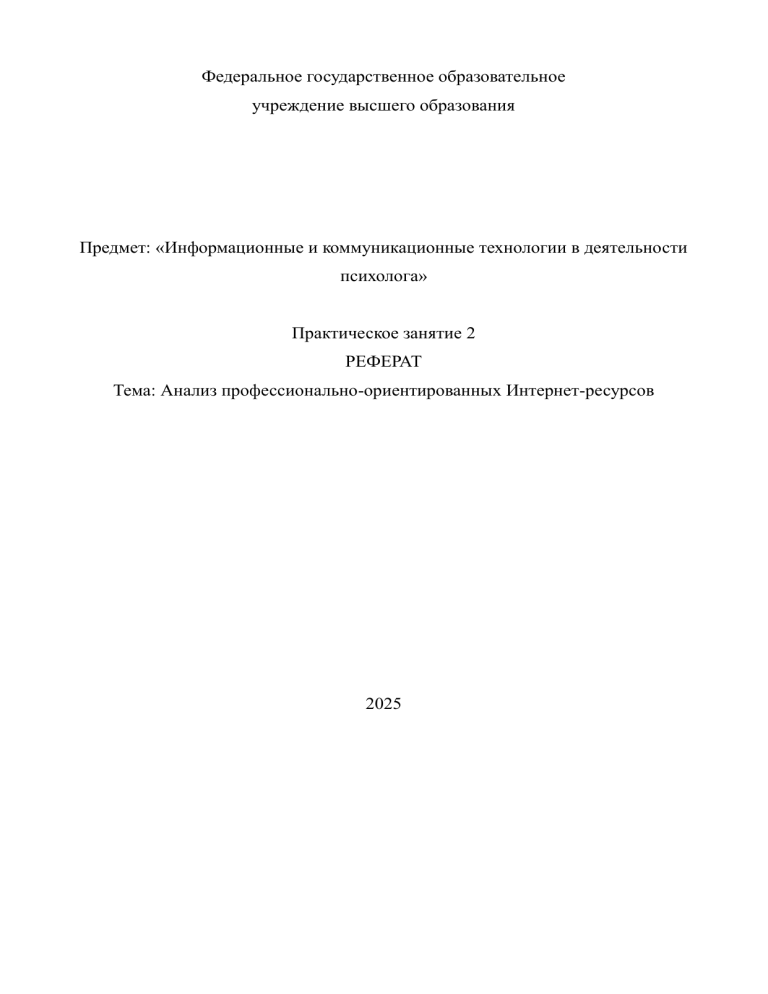 Федеральное государственное образовательное учреждение высшего образования Предмет: «Информационные и коммуникационные технологии в деятельности психолога» Практическое занятие 2 РЕФЕРАТ Тема: Анализ профессионально-ориентированных Интернет-ресурсов 2025 2 Содержание 1. Введение .................................................................................................................. 4 2. Понятие информационной культуры педагога-психолога ................................. 5 Определение информационной культуры .............................................................. 5 Исторический контекст развития информационной культуры ............................ 6 Роль информационной культуры в профессиональной деятельности педагогапсихолога ................................................................................................................... 7 3. Компоненты информационной культуры педагога-психолога .......................... 9 Информационная грамотность и ее составляющие .............................................. 9 Навыки поиска и анализа информации ................................................................ 10 Использование информационных технологий в работе педагога-психолога .. 10 4. Значимость информационной культуры для педагога-психолога ................... 12 Влияние на качество образовательного процесса ............................................... 12 Психология и информационная культура: взаимосвязь ..................................... 13 Профессиональное развитие и рост квалификации ........................................... 14 5. Пути формирования информационной культуры педагога-психолога ........... 17 Образовательные программы и курсы повышения квалификации ................... 17 Самообразование и профессиональная рефлексия ............................................. 18 Внедрение информационных технологий в образовательный процесс ........... 19 6. Важность формирования информационной культуры у специалистов в области психологии и педагогики ...................................................................... 21 Актуальность информационной культуры в современном обществе ............... 21 Социальные и культурные аспекты формирования информационной культуры .................................................................................................................................. 22 Перспективы развития информационной культуры в педагогической практике .................................................................................................................................. 23 3 7. Заключение............................................................................................................ 25 8. Список литературы .............................................................................................. 26 4 Введение В современном обществе вопросы формирования и развития информационной культуры приобретают особую значимость. Образовательная среда требует от специалистов высокой степени информационной грамотности, что обусловлено необходимостью эффективного взаимодействия с учениками, родителями и коллегами. Особую важность информационная культура приобретает для педагогов-психологов, которые играют ключевую роль в образовательном процессе. Их деятельность требует умения находить, анализировать и использовать информацию для решения профессиональных задач и обеспечения качественного образовательного процесса. Несмотря на очевидную значимость информационной культуры, её уровень у многих педагогов-психологов остаётся недостаточным. Это связано с отсутствием системного подхода к её формированию в рамках образовательных программ. Недостаточный уровень информационной культуры приводит к снижению эффективности профессиональной деятельности специалистов, затрудняет их адаптацию к изменениям в обра