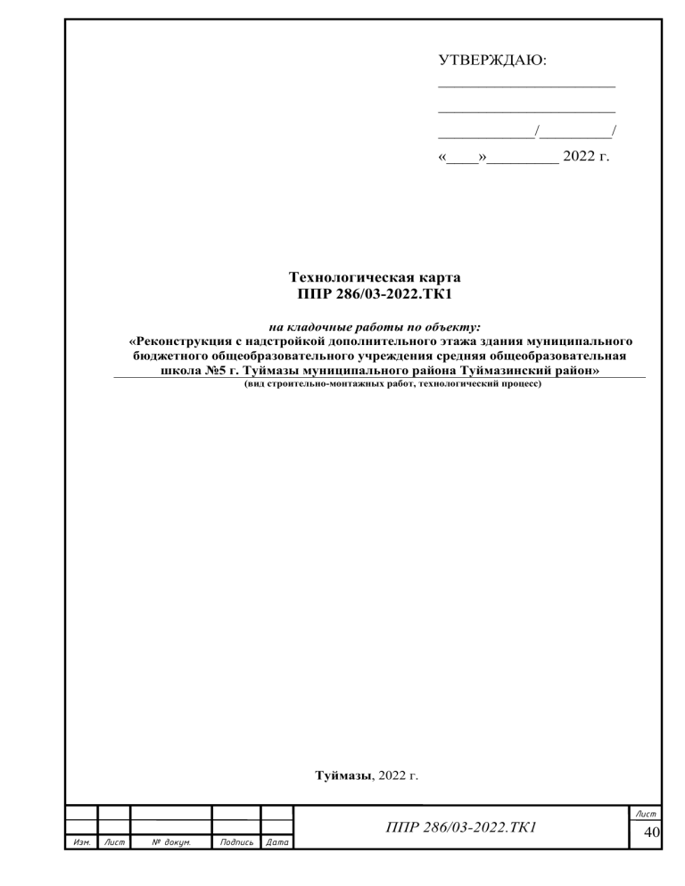 УТВЕРЖДАЮ: ______________________ ______________________ ____________/_________/ «____»_________ 2022 г. Технологическая карта ППР 286/03-2022.ТК1 на кладочные работы по объекту: «Реконструкция с надстройкой дополнительного этажа здания муниципального бюджетного общеобразовательного учреждения средняя общеобразовательная школа №5 г. Туймазы муниципального района Туймазинский район» (вид строительно-монтажных работ, технологический процесс) Туймазы, 2022 г. Изм. Лист № докум. Подпись Дата ППР 286/03-2022.ТК1 Лист 40 1 Общие сведения Технологическая карта (далее – ТК) разработана по объекту: «Реконструкция с надстройкой дополнительного этажа здания муниципального бюджетного общеобразовательного учреждения средняя общеобразовательная школа №5 г. Туймазы муниципального района Туймазинский район». Технологической картой предусмотрено выполнение работ комплексным механизированным звеном в составе: ручной электрический миксер ЗУБР ЗМР-1350Э1 "ЭКСПЕРТ" ( фазная 380/220 В, 1200 Вт); передвижная бензиновая электростанция Honda ET12000 (311 кВт, 150 кг); автомобильный стреловой кран КС- 25,0 т) в качестве ведущего механизма. 45717 (грузоподъемность Для кладки наружных стен из газобетонных блоков в качестве основных материалов используются: универсальный, кровельный гидроизол ЭПП в соответствии с ГОСТ 741586; кладочно-клеевой раствор Kesto Eco Blok в соответствии с газобетонные блоки D500 размером 600х300х200 мм в соответствии сГОСТ 31360-2007. 2. Основные указания к производству работ 3.1. В соответствии с СП 48.13330.2019 "СНиП 12-01-2004 Организация строительства. Актуализированная редакция" до начала выполнения строительно-монтажных работ на объекте Подрядчик обязан в установленном порядке получить у Заказчика проектную документацию и разрешение на выполнение строительно-монтажных работ. Выполнение работ без разрешения запрещается. 3.2. До начала производства работ по кладке наружных стен из газобетонных блоков необходимо провести комплекс организационно-технических мероприятий, в том числе: - назначить лиц, ответственных за безопасное производство работ, а также их контроль и качество выполнения; - провести инструктаж членов бригады по технике безопасности; - установить временные инвентарные бытовые помещения для хранения строительных материалов, инструмента, инвентаря, обогрева рабочих, приёма пищи, сушки и хранения рабочей одежды, санузлов и т.п.; - обеспечить участок утвержденной к производству работ рабочей документацией; - подготовить к производству работ машины, механизмы и оборудования и доставить их на объект; - обеспечить рабочих ручными машинами, инструментами и средствами индивидуальной защиты; - обеспечить строительную площадку противопожарным инвентарем и средствами сигнализации; - подготовить места для складирования строительных материалов, изделий и конструкций; - оградить строительную площадку и выставить предупредительные знаки, освещенные в ночное время; - обеспечить связь для оперативно-диспетчерского управления производством работ; - доставить в зону работ необходимые материалы, приспособления, инвентарь, инструменты и средства для безопасного производства работ; - проверить сертификаты качества на газобетонные блоки, клеевую смесь, перемычки, арматурную сталь; - составить акт готовности объекта к производству работ; - получить у Заказчика разрешение на начало производства работ. 3.3. До нача