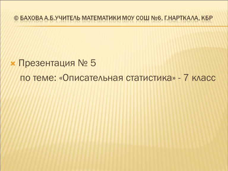 Презентация № 5 по теме: «Описательная статистика» - 7 класс Описательная статистика Наибольшее и наименьшее значение. Размах , мода Отклонения Дисперсия Обозначения и формулы Свойства среднего арифметического и дисперсии Наибольшее и наименьшее значение. Пример 1 Петя и Вася поспорили, кто лучше прыгает в длину с места. Чтобы избежать случайности, они решили, что будут прыгать по очереди 5 раз. Результаты своих прыжков в сантиметрах они записали в таблицу. Пример 1 (стр.54) Результаты прыжков в длину с места, см Номер прыжка Петя Вася 1 190 185 2 205 200 3 195 215 4 210 190 5 200 190 Определение Разность между наибольшим и наименьшим числом называется размахом набора чисел. Таблица 6. Производство пшеницы в России в 1995-2001 гг. Год 1995 1996 1997 1998 1999 2000 2001 Млн.тонн 30,1 34,9 44,3 27,0 31,0 34,5 47,0 Размах показывает, насколько велико рассеивание значений в числовом наборе. При изучении учебной нагрузки учащихся выделили группу из 12 семиклассников. Их попросили отметить в определенный день время (в минутах), затраченное на выполнение домашнего задания по алгебре. Получили такие данные: 23, 18, 25, 20, 25, 25, 32, 37, 34, 26, 34, 25. 23 28 25 20 25 25 32 37 34 26 34 25 324 27 12 12 27 – среднее значение Наибольшее значение – 37; наименьшее значение – 18; Размах ряда равен 37 – 18 = 19 При анализе сведений о времени, затраченном семиклассниками на выполнение домашнего задания по алгебре, нас могут интересовать не только среднее арифметическое и размах полученного ряда данных, но и другие показатели. Интересно, например, знать, какой расход времени является типичным для выделенной группы учащихся, то есть какое число встречается в ряду данных чаще всего. Нетрудно заметить, что таким числом является число 25. Говорят, что число 25 – мода рассматриваемого ряда. Модой ряда чисел называется число, чаще других встречающееся в данном ряду. Ряд чисел может иметь более одной моды или не иметь моды совсем. Рассмотрим еще пример. Пусть, проведя учет деталей, изготовленных за смену рабочими одной бригады, получили такой ряд данных: 36, 35, 35, 36, 37, 37, 36, 37, 38, 36, 36, 36, 39, 39, 37, 39, 38, 38, 36, 39, 36. Найдем для него среднее арифметическое, размах и моду. Для этого удобно предварительно составить из полученных данных упорядоченный ряд чисел, т. е. такой ряд, в котором каждое последующее число не меньше (или не больше) предыдущего. Получим: 35, 35, 36, 36, 36, 36, 36, 36, 36, 36, 37, 37, 37, 37, 38, 38, 38, 39, 39, 39, 39. Вычислим среднее арифметическое: 35 2 36 8 37 4 38 3 39 4 776 37 21 21 Размах ряда равен 39 35 4 . Мода данного ряда равна 36, так как число 36 чаще всего встречается в этом ряду. Например, в ряду чисел 47, 46, 50, 52, 47, 52, 49, 45, 43, 53 две моды – это числа 47 и 52, а в ряду чисел 69, 68, 66, 80, 67, 65, 71, 74, 63, 73, 72 моды нет. Моду ряда данных обычно находят тогда, когда хотят выявить некоторый типичный показатель. Например, если изучаются данные о размерах мужских сорочек, проданных в определенный день в универмаге, то удобно воспользоваться таким показателем, как мода, который характеризует размер, пользующийся наибольшим спросом. Находить в этом случае среднее арифметическое не имеет смысла. Мода является наиболее приемлемым показателем при выявлении, например, расфасовки некоторого товара, которой отдают предпочтение покупатели; цены на товар данного вида, наиболее распространенной на рынке, и т. п. Итак, средняя выработка рабочих за смену составляет примерно 37 деталей; различие в выработке рабочих не превосходит 4 деталей; тип