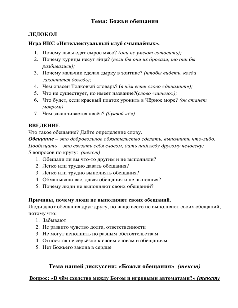 Тема: Божьи обещания ЛЕДОКОЛ Игра ИКС «Интеллектуальный клуб смышлёных». 1. Почему львы едят сырое мясо? (они не умеют готовить); 2. Почему курицы несут яйца? (если бы они их бросали, то они бы разбивались); 3. Почему мальчик сделал дырку в зонтике? (чтобы видеть, когда закончится дождь); 4. Чем опасен Толковый словарь? (в нём есть слово «динамит»); 5. Что не существует, но имеет название?(слово «ничего»); 6. Что будет, если красный платок уронить в Чёрное море? (он станет мокрым) 7. Чем заканчивается «всё»? (буквой «ё») ВВЕДЕНИЕ Что такое обещание? Дайте определение слову. Обещание – это добровольное обязательство сделать, выполнить что-либо. Пообещать – это связать себя словом, дать надежду другому человеку; 5 вопросов по кругу: (текст) 1. Обещали ли вы что-то другим и не выполняли? 2. Легко или трудно давать обещания? 3. Легко или трудно выполнять обещания? 4. Обманывали вас, давая обещания и не выполняя? 5. Почему люди не выполняют своих обещаний? Причины, почему люди не выполняют своих обещаний. Люди дают обещания друг другу, но чаще всего не выполняют своих обещаний, потому что: 1. Забывают 2. Не развито чувство долга, ответственности 3. Не могут исполнить по разным обстоятельствам 4. Относятся не серьёзно к своим словам и обещаниям 5. Нет Божьего закона в сердце Тема нашей дискуссии: «Божьи обещания» (текст) Вопрос: «В чём сходство между Богом и игровыми автоматами?» (текст) Провокационный вопрос, неправда ли? Кто из вас играл на игровых автоматах? Зачем вы это делали? Зачем люди играют в игровые автоматы? 1. Может потому, что они красивые 2. Чтобы испытать счастье, фортуну 3. Чтобы разбогатеть 4. Потому что это доставляет удовольствие (азарт) 5. Играют, чтобы получать острые ощущения (адреналин) 6. Играют, чтобы расслабиться, отдохнуть 7. Чтобы удовлетворить потребность (нужду) в чём-то Предлагаю послушать несколько интересных фактов, об игровых автоматах: 1. Один из самых первых игровых автоматов по имени «Колокол Свободы», в первый же день пытались украсть, чтобы открыть свой собственный бизнес. 2. В Германии немецкое законодательство запрещает игроку за 1 час проигрывать в игровые автоматы более 80 евро! Стоит это учесть, если вы планируете во время своего посещения Германии попробовать удачу в немецких казино и поиграть в автоматы. 3. Многие игроки любят играть в автоматы со слотами на фруктовую тематику. А знаете ли вы, что появление таких автоматов ни что иное, как результат некогда существовавшего на территории США запрета на азартные игры? Дело в том, что, поняв степень «опасности» игровых автоматов, американское правительство постановило, чтобы все автоматы либо уничтожались, либо же были переделаны так, чтобы выигрыш выдавался исключительно в виде конфет, жевательной резинки и т.п. На таких «конфетных» игровых автоматах были нанесены символы в виде фруктов и ягод. После запрет был снят, а эти символы так полюбились игрокам, что надежно закрепились в слот-автоматах и по сей день! 4. Самая азартная в мире нация, это австралийцы. Даже в США количество слотаппаратов на душу населения в пять раз меньше, чем в Австралии. В 2002 году игровые автоматы, находящиеся в барах, кафе, гостиницах и т.д. принесли стране прибыль в 4 миллиарда долларов. Бурный рост количества игровых автоматов привел к негативным последствиям в жизни местных жителей. Социальные и религиозные слу