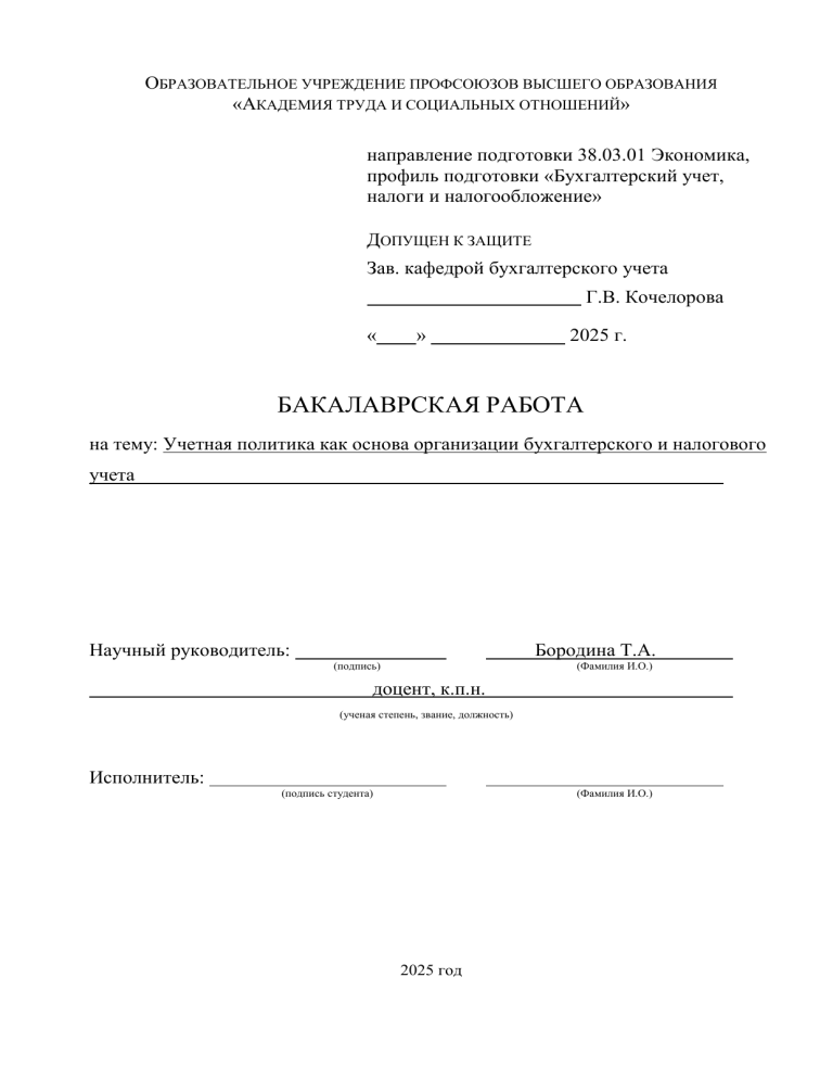 ОБРАЗОВАТЕЛЬНОЕ УЧРЕЖДЕНИЕ ПРОФСОЮЗОВ ВЫСШЕГО ОБРАЗОВАНИЯ «АКАДЕМИЯ ТРУДА И СОЦИАЛЬНЫХ ОТНОШЕНИЙ» направление подготовки 38.03.01 Экономика, профиль подготовки «Бухгалтерский учет, налоги и налогообложение» ДОПУЩЕН К ЗАЩИТЕ Зав. кафедрой бухгалтерского учета Г.В. Кочелорова « » 2025 г. БАКАЛАВРСКАЯ РАБОТА на тему: Учетная политика как основа организации бухгалтерского и налогового учета Научный руководитель: Бородина Т.А. (подпись) (Фамилия И.О.) доцент, к.п.н. (ученая степень, звание, должность) Исполнитель: (подпись студента) (Фамилия И.О.) 2025 год ОГЛАВЛЕНИЕ ВВЕДЕНИЕ .................................................................................................................... 3 1. ТЕОРЕТИЧЕСКИЕ АСПЕКТЫ ФОРМИРОВАНИЯ УЧЕТНОЙ ПОЛИТИКИ ПРЕДПРИЯТИЯ ............................................................................................................ 5 1.1. Понятие и сущность учетной политики предприятия, ее виды и принципы формирования ............................................................................................................. 5 1.2. Нормативно – правовые основы формирования учетной политики ......... 10 1.3. Оценка эффективности учетной политики предприятия ........................... 18 2. АНАЛИЗ ЭФФЕКТИВНОСТИ УЧЕТНОЙ ПОЛИТИКИ ОРГАНИЗАЦИИ ЭКСПЛУАТАЦИОННОЕ ВАГОННОЕ ДЕПО КРАСНОЯРСК - ВОСТОЧНЫЙ23 2.1. Краткая организационно-экономическая характеристика организации... 23 2.2. Анализ элементов учетной политики, влияющих на организацию бухгалтерского и налогового учета ........................................................................ 31 2.3. Анализ эффективности учетной политики ЭВД Красноярск-Восточный для ведения бухгалтерского и налогового учета................................................... 42 3. РАЗРАБОТКА РЕКОМЕНДАЦИЙ ПОВЫШЕНИЯ ЭФФЕКТИВНОСТИ УЧЕТНОЙ ПОЛИТИКИ ДЛЯ ЦЕЛЕЙ БУХГАЛТЕРСКОГО И НАЛОГОВОГО УЧЕТА ............................................. ОШИБКА! ЗАКЛАДКА НЕ ОПРЕДЕЛЕНА. 3.1. Проблемы учетной политики и рекомендации по ее совершенствованию Ошибка! Закладка не определена. 3.2 Оценка экономической эффективности предлагаемых мероприятий Ошибка! Закладка не определена. СПИСОК ИСПОЛЬЗОВАННЫХ ИСТОЧНИКОВ.................................................. 77 2 ВВЕДЕНИЕ Актуальность работы обусловлена тем, что учетная политика по уровням нормативного регулирования бухгалтерского учета относится к стандартам экономического субъекта. Потребность в разработке такого документа возникает у организаций в связи с тем, что невозможно вести учет абсолютно идентично на предприятиях с разными видами деятельности, структурой управления, объемами производства и, наконец, разными стратегиями развития. Отличия проявляются, преимущественно, в степени детализации учетных данных, в количестве объектов учета, объемах информации, раскрываемой в бухгалтерской (финансовой) отчетности. Кроме этого, на учетную политику организации, особенно, на полноту раскрытия ее раздела, касающегося управленческого учета, влияет финансовое состояние субъекта. Это связано с тем, что постановка отдельной системы управленческого учета, являясь весьма затратной, по силам только финансового благополучным организациям, имеющим перспективы роста и в дальнейшем. Учетная политика устанавливает правила оценки отдельных объектов учета. Следовательно, от ее содержания в определенной степени зависят показатели, формируемые в бухгалтерской (финансовой) отчетности, которая, в свою очередь, используется определенными группами пользователей для принятия решений в процессе взаимодействия с данным суб