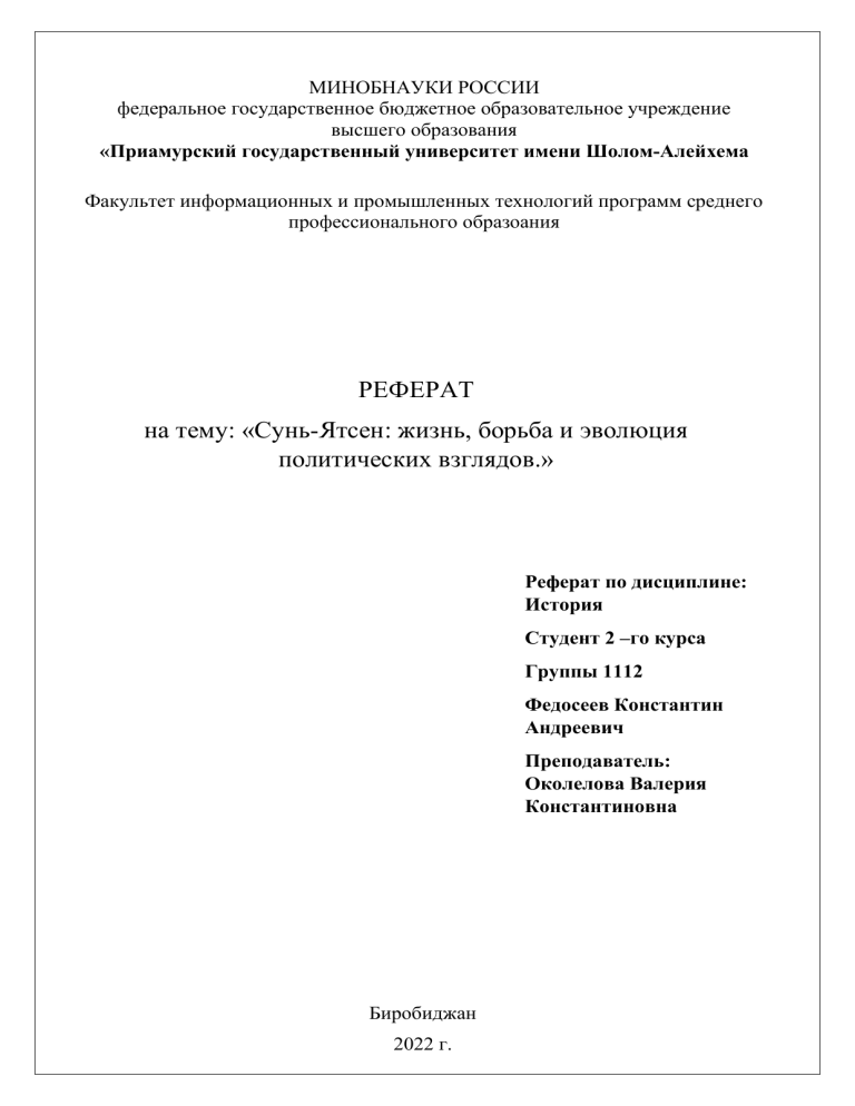 МИНОБНАУКИ РОССИИ федеральное государственное бюджетное образовательное учреждение высшего образования «Приамурский государственный университет имени Шолом-Алейхема Факультет информационных и промышленных технологий программ среднего профессионального образоания РЕФЕРАТ на тему: «Сунь-Ятсен: жизнь, борьба и эволюция политических взглядов.» Реферат по дисциплине: История Студент 2 –го курса Группы 1112 Федосеев Константин Андреевич Преподаватель: Околелова Валерия Константиновна Биробиджан 2022 г. Оглавление: 1) Введение 2) Основная часть А) Жизнь Б) Политические взгляды В) Синьхайская революция Г) Политическая борьба. Партия Гоминьдан. Д) Учение Сунь Ятсена. Политическая деятельность. 3) Заключение 4) Список источников Введение: Актуальность: Интерес данной темы заключается в том, что для истории Китая важен выбор иного пути развития, а так же новых революционных и прогрессивных взглядов Сунь Ятсена. Его жизнь и его борьба за процветание его страны и его народа. Цель: Проанализировать жизнь и политические взгляды Сунь Ятсена. Задачи: 1) Рассказать об жизни Сунь Ятсена. 2) Показать как, в разные периоды жизни Сунь Ятсена, развивались его политические взгляды. 3) Рассказать о революционном пути Сунь Ятсена. Объект исследования: Революционная борьба и жизнь Сунь Ятсена. Основная часть: Жизнь. Сунь Ятсен родился 12 ноября 1866 года в деревне Цуйхэн уезда Сяншань. Когда малыш подрос, ему дали имя Вэнь. Сунь Вэнь («Просвещенный») с малых лет помогал старшим на работе в поле. В эти годы мальчик очень привязался к своему дяде. Тогда и началось зарождение в Сунь Вэне революционных идей, поскольку его дядя был солдатом Тайпинской армии, обосновавшимся в Цуйхэне несколько лет назад. К тому же дядя был учителем в школе, в которую вскоре Вэня отвел его отец, поэтому именно его влияние было первостепенным. Когда Сунь Вэню было 12 лет произошло событие, имевшее важное значение в его жизни. В 1879 году он был отправлен родителями на Гавайские острова к старшему брату Сунь Мэю, который еще в 1871 году по примеру десятков тысяч его земляков из приморских провинций Южного Китая эмигрировал в поисках работы. Живя у брата, мальчик получил начальное образование в английской миссионерской школе на острове Маун, которую закончил с отличием в 1881 году. Брат устроил его в американскую среднюю школу, но Вэнь так и не закончил ее, а возвратился в 1883 году обратно на родину в Китай. Произошло это из-за опасений Сунь Мэя, который видел, что в сознании юноши происходили изменения. Сунь Вэнь не хотел становиться купцом, как брат, его волновали совершенно другие проблемы. Он размышлял над вопросами судьбы своей Родины, читал книги, газеты, новости о событиях в разных странах мира; в его голове рождались высокие мысли о несправедливости и пренебрежении человеческим достоинством в Китае. Поэтому, чтобы пресечь «заблуждения» младшего брата, Сунь Мэй отправляет Сунь Вэня домой. Вернувшись в Китай, Сунь Вэнь продолжал образование в медицинском училище в Кантоне, а затем в Гонконге – в медицинском институте, который закончил в 1892 году. Являясь по образованию врачом, Сунь Ятсен однако медицинской практикой занимался очень короткое время, отдав всю свою сознательную жизнь революционной деятельности. В Гонконге он обратился в христианство, тогда же принял имя Сунь Ятсен («Скрываю