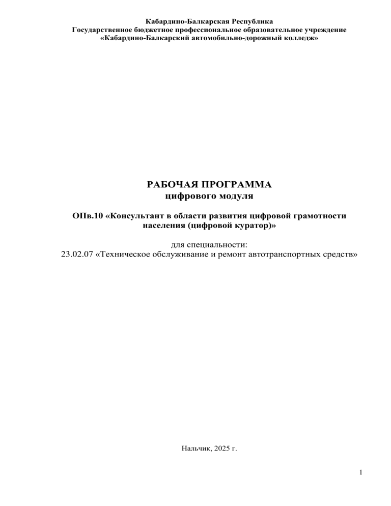 Кабардино-Балкарская Республика Государственное бюджетное профессиональное образовательное учреждение «Кабардино-Балкарский автомобильно-дорожный колледж» РАБОЧАЯ ПРОГРАММА цифрового модуля ОПв.10 «Консультант в области развития цифровой грамотности населения (цифровой куратор)» для специальности: 23.02.07 «Техническое обслуживание и ремонт автотранспортных средств» Нальчик, 2025 г. 1 Рассмотрена на заседании ЦМК профессиональных дисциплин Протокол № _____ от ____________ 2025 г. Председатель: ___________ /Жеруков А.В./ «Утверждаю» заместитель директора по УМР ГБПОУ «КБАДК» ______________ /С.Ю.Какулина/ Рабочая программа цифрового модуля, встраиваемого в дисциплину общего профессионального цикла «Консультант в области развития цифровой грамотности населения (цифровой куратор)» входит в общий профессиональный цикл под индексом ОПв.10 и составлена в соответствии с Требованиями к разработке и оформлению рабочих программ учебных дисциплин, адаптационных дисциплин, профессиональных модулей, учебных и производственных практик и дополнительного образования в КБАДК, рассмотренными на заседании Методического совета ГБПОУ «КБАДК» (протокол № 2 от 10 января 2023 г.) и утвержденными директором ГБПОУ «КБАДК», макетом образовательного модуля в рамках примерной образовательной программы «Профессионалитет», предусматривающего формирование навыков обучающихся по освоению профессиональных компетенций для цифровой экономики (Цифрового модуля) утверждённым Советом учреждения протокол от 23 марта 2023 г. № 4 приказ ФГБОУ ДПО ИРПО от «30» марта 2023 г. № П-132 по специальности 23.02.07 «Техническое обслуживание и ремонт автотранспортных средств» Организация-разработчик: Государственное бюджетное профессиональное образовательное учреждение «Кабардино-Балкарский автомобильно-дорожный колледж» Разработчики: Какулина С.Ю. Заместитель директора по УМР 2 СОДЕРЖАНИЕ 1. Общая характеристика рабочей программы цифрового модуля ..............................4 1.2. Место учебной дисциплины в структуре основной образовательной программы ................................................................................................................................4 1.3. Цель и планируемые результаты освоения учебной дисциплины .........................4 2. Структура и содержание учебной дисциплины.............................................................8 2.1. Объем учебной дисциплины и виды учебной работы ...............................................8 2.2. Тематический план и содержание учебной дисциплины .........................................9 3. Условия реализации программы учебной дисциплины ............................................16 3.1. Материально-техническое и кадровое обеспечение ................................................16 3.2. Информационное обеспечение реализации программы .........................................16 4. Контроль и оценка результатов освоения цифрового модуля .................................18 3 1. Общая характеристика рабочей программы цифрового модуля ОПв.10 «Консультант в области развития цифровой грамотности населения (цифровой куратор)» Цифровой модуль «Консультант в области развития цифровой грамотности (цифровой куратор) 3 уровня квалификации, разработана на основе документов: -Федеральный закон № 273- ФЗ «Об образовании в Российской Федерации» от 29 декабря 2012 года. -Профессиональный стандарт "Консультант в области развития цифровой грамотности населения (цифровой куратор). УТВЕРЖДЕН приказом Министерства труда и социальной защиты Российской Федера