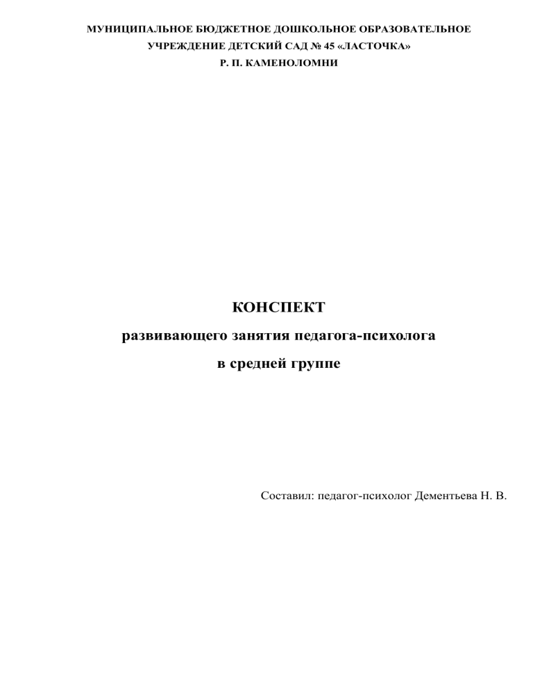 МУНИЦИПАЛЬНОЕ БЮДЖЕТНОЕ ДОШКОЛЬНОЕ ОБРАЗОВАТЕЛЬНОЕ УЧРЕЖДЕНИЕ ДЕТСКИЙ САД № 45 «ЛАСТОЧКА» Р. П. КАМЕНОЛОМНИ КОНСПЕКТ развивающего занятия педагога-психолога в средней группе Составил: педагог-психолог Дементьева Н. В. Цель: развитие познавательной, эмоциональной и коммуникативной сферы детей. Задачи: Развитие внимания, памяти, мышления, речевое развитие. Развитие сенсорных анализаторов (зрительных, слуховых), зрительномоторной координации. Развитие уверенности в себе, коммуникативных навыков. Участники: дети средней группы. Время занятия: 20 минут. Оборудование: «волшебный мешочек» с различными предметами или корзинка, мяч или веселый смайлик; для упражнения «Кто лучше слышит» - маленькая ширма, смятая бумага, колокольчик, шуршащий пакет, игрушка-пищалка, стакан с водой и ложкой; мяч. Ход занятия Приветствие Цель: создание психологического комфорта у детей. Психолог: - Здравствуйте, ребята, я очень рада вас видеть! Давайте все вместе встанем в круг и поприветствуем друг друга улыбками. (после приветствия дети садятся полукругом на стульчики) - Ребята, посмотрите сколько интересного у меня на столе. Давайте вместе рассмотрим все предметы и поиграем в интересную игру, которая называется «Чудесный мешочек» («Что исчезло?»). Вариант 1 «Чудесный мешочек» Цель: развитие тактильного восприятия, внимания, памяти. Оборудование: стол, «волшебный мешочек» с различными предметами, корзинка. Детям предлагается рассмотреть мелкие игрушки, которые затем складываются в мешочек. Дети поочередно ощупывают одну из находящихся в мешочке игрушек, называют ее, а затем вынимают и показывают игрушку всем участникам группы. Вариант 2 «Что исчезло?» Перед детьми выставляют 7 - 10 игрушек. Дети их запоминают, затем игрушки закрываются ширмой. Одна игрушка убирается. Дети должны ее отгадать. - Молодцы, ребята, а сейчас мы с вами поиграем в игру, которая называется «Что бывает…» «Что бывает…» Цель: развитие мышления, внимания, речи, расширение кругозора, стимуляция познавательной активности. Оборудование: мяч. На каждый вопрос психолог кидает мячик каждому из детей, они отвечают и кидают мяч обратно психологу. Начать игру словами: Что бывает мягким? Психолог начинает первым и предлагает свои варианты, включая детей в игру и активизируя мышление - Мягким может быть хлеб, а еще подушка, а еще мягким может быть… Что бывает круглым? Что бывает сладким? Что бывает горячим? Что бывает пушистым? Что бывает красным? Что бывает желтым? Что бывает синим? Физкультминутка «Ветер дует нам в лицо» Вместе с ребенком имитируем дуновение ветра, качая туловище и помогая руками. Ветер дует нам в лицо Ветер дует нам в лицо, Закачалось деревцо. Ветер тише, тише, тише. (присесть) Деревцо все выше, выше. (встать и вытянуть руки вверх) Руки подняли и покачали – Это деревья в лесу. (плавное покачивание поднятыми вверх руками) Руки нагнули, кисти встряхнули – Ветер сбивает росу. (встряхивание рук перед собой) В стороны руки, плавно помашем – Это к нам птицы летят. (горизонтальные, одновременные движения руками вправо — влево) Как они сядут, тоже покажем – Крылья сложили назад (2 раза) «Кто лучше слышит» Цель: развитие слухового внимания, мышления. Оборудование: стол, маленькая ширма, смятая бумага, колокольчик, шуршащий пакет, игрушка-пищалка, стакан с водой и ложкой. Дети закрывают глаза. П