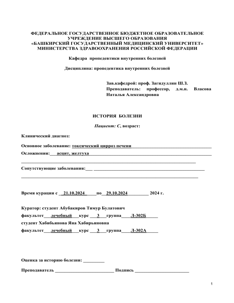 ФЕДЕРАЛЬНОЕ ГОСУДАРСТВЕННОЕ БЮДЖЕТНОЕ ОБРАЗОВАТЕЛЬНОЕ УЧРЕЖДЕНИЕ ВЫСШЕГО ОБРАЗОВАНИЯ «БАШКИРСКИЙ ГОСУДАРСТВЕННЫЙ МЕДИЦИНСКИЙ УНИВЕРСИТЕТ» МИНИСТЕРСТВА ЗДРАВООХРАНЕНИЯ РОССИЙСКОЙ ФЕДЕРАЦИИ Кафедра пропедевтики внутренних болезней Дисциплина: пропедевтика внутренних болезней Зав.кафедрой: проф. Загидуллин Ш.З. Преподаватель: профессор, д.м.н. Наталья Александровна Власова ИСТОРИЯ БОЛЕЗНИ Пациент: С, возраст: Клинический диагноз: Основное заболевание: токсический цирроз печени__________________________________ Осложнения:___асцит, желтуха____________________________________________________ __________________________________________________________________________ Сопутствующие заболевания:___ _______________________________________________ ___________________________________________________________________________ Время курации с __21.10.2024_____по__29.10.2024_________ 2024 г. Куратор: студент Абубакиров Тимур Булатович факультет___лечебный___курс ___3___группа____Л-302Б_____ студент Хабибьянова Яна Хабирьяновна факультет___лечебный___курс ___3___группа____Л-302А_____ Оценка за историю болезни: _________ Преподаватель _________________________ Подпись _______________________ 1 СХЕМА ИСТОРИИ БОЛЕЗНИ 1. ПАСПОРТНАЯ ЧАСТЬ. 1) ФИО: С. 2) возраст 69 лет 5) Социальное положение: пенсионер, до пенсии - водитель 7) Инвалидности нет 8) Житель города Уфа 9) Дата госпитализации 21.10.2024 10) Отделение гастроэнтерологии 2. ЖАЛОБЫ 1)жалобы на момент поступления больного в клинику: периодические боли в области правого подреберья, желтуха, асцит, общая слабость 2)жалобы на момент осмотра: жалобы на момент поступления больного в клинику: периодические боли в области правого подреберья, желтуха, асцит, общая слабость АКТИВНЫЙ РАССПРОС ЖАЛОБ ПО СИСТЕМАМ ОБЩЕЕ СОСТОЯНИЕ Плохое общее самочувствие, слабость, недомогание, быстрая утомляемость, снижение работоспособности, снижение аппетита СИСТЕМА ОРГАНОВ ДЫХАНИЯ Боль в грудной клетке: отсутствует Одышка (dyspnoe): отсутствует Кашель: отсутствует Мокрота: отсутствует Кровохарканье: отсутствует Дыхание через нос: свободное. Голос: звучный, охриплый. СИСТЕМА ОРГАНОВ КРОВООБРАЩЕНИЯ Боль в области сердца: отсутствует Сочетание боли с одышкой (dyspnoe): отсутствует Сердцебиение (palpatio cordls), перебои в сердце: Пульс 70уд/мин, АД 120/75, наполненный, равномерный, быстрый, ритмичный. Отеки (oedema): Медленно растущий асцит: в вертикальном полождении живот выглядит отвисшим, в горизонтальном положении боковые отделы живвота набухают. СИСТЕМА ОРГАНОВ ПИЩЕВАРЕНИЯ Боли в животе: отсутствуют Кровотечения: отсутствовали Стул: частота: 2 за сутки, количество умеренное, появляются примеси непереваренных жиров. Аппетит: понижен Отвращение к пище наблюдалось. Вкус во рту: горечь и сухость 2 Глотание и прохождение по пищеводу: свободное, не затрудненное Диспепсические явления: тошнота, рвота, отрыжка –присутствовали, изжога отсутствовала, Печень и желчный пузырь Боль в правом подреберье: характер болей : приступообразные, тупые; иррадиация болей отсутствовала; условия возникновения: не закономерные, случайные; Диспепсические явления: имелись Поджелудочная железа Боль: отсутствует Диспепсические явления: отсутствуют Селезенка Боль в левом подреберье: отсутствует МОЧЕВЫДЕЛИТЕЛЬНАЯ СИСТЕМА Боль: отсутствует Мочеиспускание: незатрудненное Количество мочи за сутки: в норме Дизурические расстройства: отсутствуют Цвет мочи соломенно-желтый. Отеки: отсутствуют. НЕРВНАЯ СИСТЕМА Головная боль: отсутствует Головокружение: отсутст