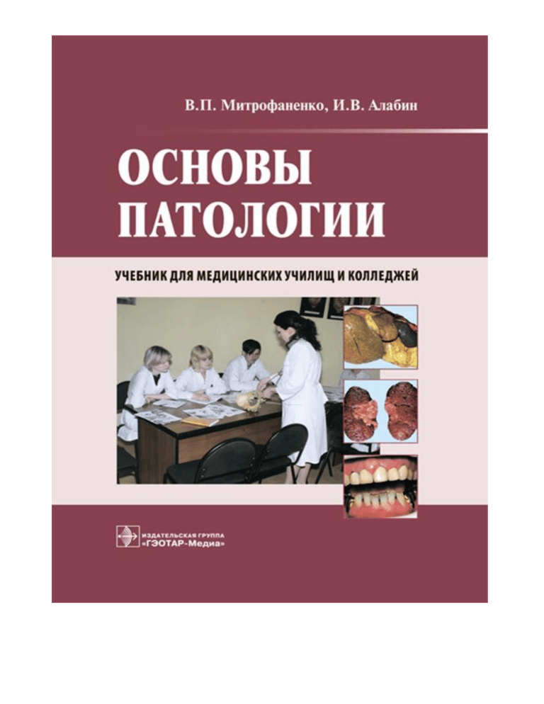 Учебник написан в соответствии с Государственным образовательным стандартом и программой, разработанной Всероссийским учебно-методическим центром по непрерывному медицинскому и фармацевтическому образованию. Состоит из двух разделов: в первом рассмотрены общие вопросы патологии, которые лежат в основе болезней, а во втором - частная патология основных систем и органов. Для самостоятельной работы студентам предложены программа для самообучения и педагогический контроль. Учебник ориентирован на подготовку студентов медицинских училищ и колледжей, обучающихся по специальностям "Лечебное дело", "Сестринское дело", "Акушерское дело" и "Стоматология". Прилагается компакт-диск с цветными иллюстрациями к учебнику и с мультимедийными презентациями основных тем. СОКРАЩЕНИЯ АД - артериальное давление АДГ - антидиуретический гормон АКТГ - адренокортикотропный гормон АТФ - аденозинтрифосфат ГБС - гипертоническая болезнь сердца ГГНС - гипоталамо-гипофизарно-надпочечниковая система ЖКТ - желудочно-кишечный тракт ИБС - ишемическая болезнь сердца КОС - кислотно-основное состояние КПР - компенсаторно-приспособительная реакция ЛПВП - липопротеиды высокой плотности ЛПНП - липопротеиды низкой плотности ПЯЛ - полиморфноядерные лейкоциты РНК - рибонуклеиновая кислота СОЭ - скорость оседания эритроцитов СПИД - синдром приобретенного иммунодефицита ФНО - фактор некроза опухолей ХНЗЛ - хронические неспецифические заболевания легких ЧДД - частота дыхательных движений ЧСС - частота сердечных сокращений ЦНС - центральная нервная система ПРЕДИСЛОВИЕ Учебник по дисциплине «Основы патологии» написан в соответствии с Примерной программой, разработанной Всероссийским учебно-научно-методическим центром по непрерывному медицинскому и фармацевтическому образованию, на основании требований Государственного образовательного стандарта среднего профессионального образования для специальностей «Лечебное дело», «Сестринское дело», «Акушерское дело» и «Стоматология». Учебник состоит из двух разделов: «Основы общей патологии» и «Основы частной патологии». Раздел «Основы общей патологии» представлен одиннадцатью главами, в которых описаны типовые патологические изменения и процессы. Представлены теоретические положения, морфологические (макро-, микро- и электронно-микроскопические) изменения и нарушения патологических процессов, лежащих в основе болезней. При описании типовых патологических процессов авторы не отказались от примеров их проявления при различных заболеваниях, полагая, что ссылки на болезни позволят лучше запомнить и ориентироваться в дальнейшем при изучении отдельных заболеваний. Они включены в программу по частной патологии, в рамках которой студент должен знать не только название болезни, ее определение, характеристику, симптомы, но также и причины, механизмы и исходы болезней. Раздел «Основы частной патологии» состоит из пяти глав, посвященных заболеваниям основных систем и органов: сердечно-сосудистой, дыхательной, пищеварительной и мочевыделительной систем, а также зубочелюстного аппарата. Целью дисциплины «Основы патологии» являются овладение студентами системой знаний по основным закономерностям развития болезней, патологических состояний, изменений в органах и в целом организме для изучения специа