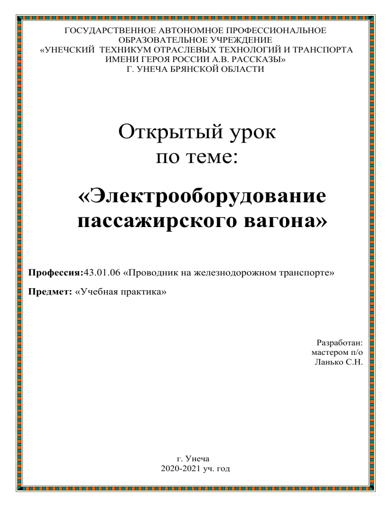 ГОСУДАРСТВЕННОЕ АВТОНОМНОЕ ПРОФЕССИОНАЛЬНОЕ ОБРАЗОВАТЕЛЬНОЕ УЧРЕЖДЕНИЕ «УНЕЧСКИЙ ТЕХНИКУМ ОТРАСЛЕВЫХ ТЕХНОЛОГИЙ И ТРАНСПОРТА ИМЕНИ ГЕРОЯ РОССИИ А.В. РАССКАЗЫ» Г. УНЕЧА БРЯНСКОЙ ОБЛАСТИ Открытый урок по теме: «Электрооборудование пассажирского вагона» Профессия:43.01.06 «Проводник на железнодорожном транспорте» Предмет: «Учебная практика» Разработан: мастером п/о Ланько С.Н. г. Унеча 2020-2021 уч. год «Утверждаю» Ст. мастер ___________________ План урока учебной практики ПМ 02 Обслуживание вагонов и их оборудования в пути следования. Тема урока: «Электрооборудование пассажирского вагона». Цель урока: комплексное освоение обучающимися видов профессиональной деятельности: проверка электрооборудования при отравлении вагона в рейс, содержание аккумуляторных батарей в исправном состоянии, не допуская разрядки, перезарядки и загрязнения, осуществление осмотра и ухода за электрическими машинами и приводами подвагонных генераторов, выявление основных неисправностей и причин их возникновения, формирование общих и профессиональных компетенций, а также приобретение опыта практической работы обучающимися по профессии: 43.01.06 «Проводник на железнодорожном транспорте». Задача: формирование у обучающихся практических профессиональных компетенций в рамках ОПОП НПО по основным видам профессиональной деятельности для освоения рабочей профессии, обучение трудовым приемам, операциям и способам выполнения трудовых процессов, характерных для соответствующей профессии и необходимых для последующего освоения ими общих (ОК 1-8) и профессиональных компетенций(2.1.-2.4.) по избранной профессии. Место проведения урока: Лаборатория Оборудование: Пассажирский вагон Организация и ход урока. 1. Организационный этап в мин (5) выявление отсутствующих обучающихся; проверка внешнего рабочего вида (соответствие требованиям ТБ); организация внимания и готовности обучающихся к уроку. 2. Вводный этап урока в мин (40) а)сообщение темы урока. б)сообщение цели урока. в)опрос по предыдущей теме и повторение правил по ТБ. Вопросы на повторение: 1. Расскажите о месте расположения и назначении распределительных шкафов? 2. Какие приборы расположены на передних панелях распределительных шкафов в вагонах разных типов? 3. Кто имеет право на открытие распределительных шкафов и каков порядок обесточивания вагона? 4. Расскажите о дневном, ночном и аварийном режимах работы электрооборудования и показаниях приборов при этих режимах? 5. Каковы особенности распределительных шкафов и приборов вагонов габарита РИЦ? е)выдача обучающимся заданий, сообщение ученических норм времени и критерии оценок. г)объяснение нового материала: значение данной операции в освоении профессии, объекты труда, показ и объяснение трудовых приёмов и действий. Последовательность выполнения задания, воспроизведение обучающимися приёмов и действий перед учебной группой, приёмы контроля в процессе выполнения задания, требования безопасности ведения работ, организация рабочего места, меры по предупреждению утомляемости. Вопросы к уроку: 1. Основные виды электрооборудования пассажирского вагона. 2. Расскажите о месте расположения электрооборудования? 3. Назначение и устройство генераторов. 4. Назначение и устройство аккумуляторных батарей. 5. Освещение пассажирских вагонов. 6. Экстренное и полное обесточива