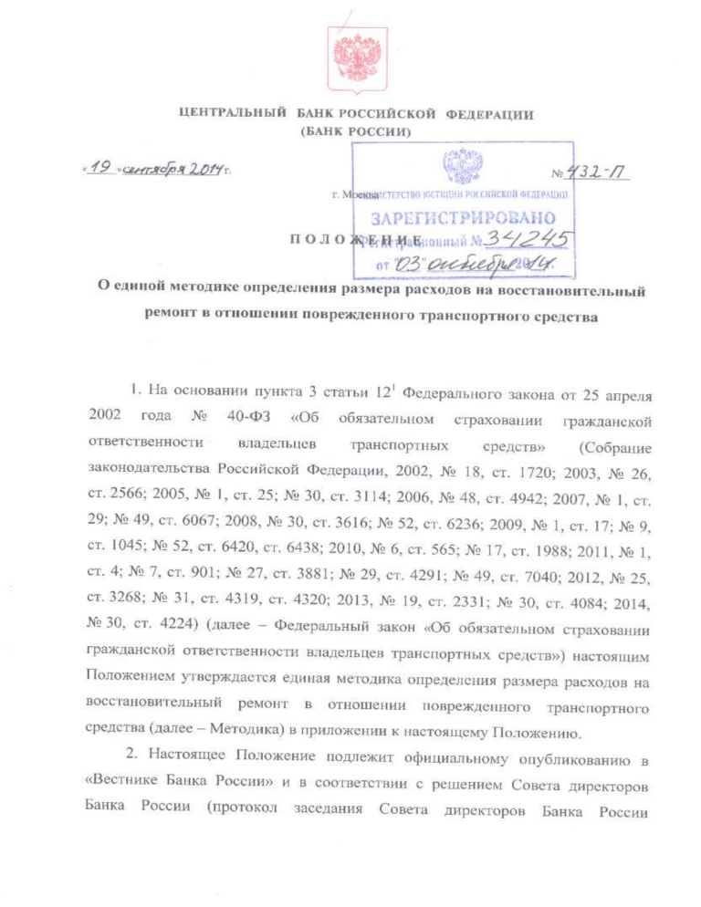 от 16 сентября 2014 года № 27) вступает в силу со дня вступления в силу постановления Правительства Российской Федерации о признании утратившим силу постановления Правительства Российской Федерации от 24 мая 2010 года № 361 «Об утверждении Правил установления размера расходов на материалы и запасные части при восстановительном ремонте транспортных средств» (Собрание законодательства Российской Федерации, 2010, № 22, ст. 2774; 2014, № 32, ст. 4490). Председатель Центрального банка Российской Федерации Э.С. Набиуллина 2 Приложение к Положению Банка России от «19» сентября 2014 года № 432-П «О единой методике определения размера расходов на восстановительный ремонт в отношении поврежденного транспортного средства» Единая методика определения размера расходов на восстановительный ремонт в отношении поврежденного транспортного средства Настоящая Методика является обязательной для применения страховщиками или их представителями, если они самостоятельно проводят осмотр, определяют восстановительные расходы и выплачивают страховое возмещение в соответствии Федеральным законом «Об обязательном страховании гражданской ответственности владельцев транспортных средств», экспертами-техниками, экспертными организациями при проведении независимой технической экспертизы транспортных средств, судебными экспертами при проведении судебной экспертизы транспортных средств, назначаемой в соответствии с законодательством Российской Федерации в целях определения размера страховой выплаты потерпевшему и (или) стоимости восстановительного ремонта транспортного средства в рамках договора обязательного страхования гражданской ответственности владельцев транспортных средств. Глава 1. Порядок установления наличия и характера повреждений транспортного средства, в отношении которых определяются расходы на восстановительный ремонт 1.1. Первичное установление наличия и характера повреждений, в отношении которых определяются расходы на восстановительный ремонт, производится во время осмотра транспортного средства. 3 Результаты осмотра транспортного средства фиксируются актом осмотра. Акт осмотра должен включать в себя следующие сведения: основание для проведения осмотра; дата осмотра (в том числе время начала и окончания проведения осмотра); место и условия проведения осмотра; данные регистрационных документов транспортного средства; сведения о владельце транспортного средства (фамилия, имя, отчество (при наличии) физического лица или полное наименование юридического лица); сведения о соответствии характеристик и параметров (несоответствии) транспортного идентификационных средства информации, содержащейся в регистрационных документах; дата повреждения транспортного средства; информация о пробеге транспортного средства с указанием источника данной информации; дата начала эксплуатации транспортного средства; сведения о комплектации транспортного средства; информация о повреждениях транспортного средства (характеристиках поврежденных элементов с указанием расположения, вида и объема повреждения), а также предварительное определение способа устранения повреждений и трудозатрат на выполнение не нормированных изготовителем транспортного средства ремонтных воздействий; информация о дефектах эксплуатации транспортного сре