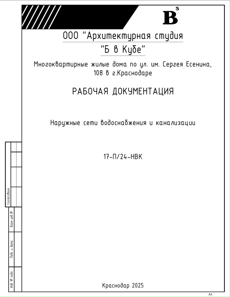 ООО "Архитектурная студия "Б в Кубе" Многоквартирные жилые дома по ул. им. Сергея Есенина 0 в г.Краснодаре РАБОЧАЯ ДОКУМЕНТАЦИЯ Наружные сети водоснабжения и канализации Инв. № подл. Подп. и дата Взам. инв. № Согласовано П 24 НВК Краснодар 2025 А4 ООО "Архитектурная студия "Б в Кубе" Многоквартирные жилые дома по ул. им. Сергея Есенина 108 в г.Краснодаре РАБОЧАЯ ДОКУМЕНТАЦИЯ Наружные сети водоснабжения и канализации Инв. № подл. Подп. и дата Взам. инв. № Согласовано 1 -П 24-НВК Изм. 1 2 3 № док. 94-25 118-25 121-25 Подп. Дата 12.08.25 10.10.25 22.10.25 Главный инженер проекта Кочетов С.Б. Краснодар 2025 А4 Разрешение Обозначение 17-П/24-НВК 121-25 Наименование объекта строительства Многоквартирные жилые дома по ул. им. Сергея Есенина, 108 в г. Краснодаре Содержание изменения Изм. Лист Код 3 1 Отражены изменения в ведомости рабочих чертежей 3 3 3-7 Стальные футляры Ф219х4,0 (ВУС) заменены на полиэтиленовые ПЭ100 SDR17 Ф200х11,9мм. Добавлен футляр L=10м от ПГ3 до В1/3-1. Отредактирован продольный профиль сети К2 3 3 8 Отредактирована таблица водопроводных колодцев 4 3 9 Отредактирована таблица накопительных колодцев №1,2,3 (применение колец диаметром 2500мм, схема 4х4х4шт.) 3 Примечание Внесение изменений в рабочую документацию на основании письма от ООО "Теплотехник" Исх. №113 от 17.10.2025г. Согласовано: Н.контр. Спецификация оборудования, изделий и материалов 3 1 Отредактировано количество пожарных подставок, позиция №3 4 3 2-4 Отредактированы применяемые в проекте футляры по сетям В1, К1, К2, 3 Изм.внес Составил ГИП Утв. Долинский Долинский Кочетов Дергунов 22.10.25 22.10.25 22.10.25 22.10.25 Общество с ограниченной ответственностью "Архитектурная студия "Б в кубе" Лист Листов 1 Согласовано: Н.контр. Разрешение Обозначение 17-П/24-НВК 118-25 Наименование объекта строительства Многоквартирные жилые дома по ул. им. Сергея Есенина, 108 в г. Краснодаре Содержание изменения Изм. Лист 2 1 Отражены изменения в ведомости рабочих чертежей 3 2 2 Обновлена посадка накопительных ёмкостей 3 2 6, 7 Отредактирован продольный профиль сети К2 3 2 9 Отредактирована таблица накопительных колодцев №1,2,3 (применение колец диаметром 2500мм, схема 4х4х4шт.) 3 Изм.внес Составил ГИП Утв. Долинский Долинский Кочетов Дергунов 10.10.25 10.10.25 10.10.25 10.10.25 Код Общество с ограниченной ответственностью "Архитектурная студия "Б в кубе" Примечание Лист Листов 1 Разрешение Обозначение 17-П/24-НВК 94-25 Наименование объекта строительства Многоквартирные жилые дома по ул. им. Сергея Есенина, 108 в г. Краснодаре Изм. Лист Содержание изменения Код 1 1 Отражены изменения в ведомости рабочих чертежей, ведомости ссылочных и прилагаемых документов. Добавлены сведения о кол-ве этажей и квартир в каждом литере 1 1 2.1 Добавлен новый лист с ситуационным планом. 1 1 5 Добавлены сведения по установке сороулавливающей корзины в канализационных колодцах К1 на выпусках из жилого дома. 4 1 9 Обновлен разрез канализационных колодцев с устройством внутренней футеровки. В таблице круглых канализационных колодцев (К1) добавлены элементы с внутренней футеровкой 4 1 10 Добавлен новый лист со схемой водомерного узла. 1 Примечание Внесение изменений в РД в соответствии с письмом №АИБ/2-21 от 21.08.2025г. 17-П/24-НВК.СО (Изм.1) 1 1 Обновлена информация по чугунной фланцевой задвижке DN80 1 1 3 Добавлено количество сороулавливающих решеток 4 Согласовано: Н.контр. Прилагаемые документы 1 1-5 1 1-5 1 1 Изм.внес Составил ГИП Утв. Добавлены технические усл