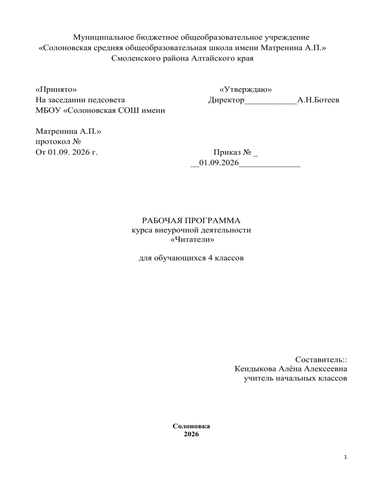 Муниципальное бюджетное общеобразовательное учреждение «Солоновская средняя общеобразовательная школа имени Матренина А.П.» Смоленского района Алтайского края «Принято» На заседании педсовета МБОУ «Солоновская СОШ имени Матренина А.П.» протокол № От 01.09. 2026 г. «Утверждаю» Директор____________А.Н.Ботеев Приказ № _ __01.09.2026______________ РАБОЧАЯ ПРОГРАММА курса внеурочной деятельности «Читатели» для обучающихся 4 классов Составитель:: Кендыкова Алёна Алексеевна учитель начальных классов Солоновка 2026 1 Рабочая программа курса внеурочной деятельности «Читательская грамотность. 4 класс» (далее – программа) включает пояснительную записку, содержание обучения, планируемые результаты освоения программы, тематическое планирование. 1. Пояснительная записка Программа внеурочной деятельности «Читатели» составлена на основе Примерных программ начального общего образования в соответствии с требованиями Федерального государственного образовательного стандарта начального общего образования, с учётом межпредметных и внутрипредметных связей, логики учебного процесса и возрастных особенностей младшего школьника. Особым этапом в жизни ребёнка является начальная школа. Этот этап связан с формированием у школьника основ умения учиться и способности к организации своей деятельности. И именно читательские умения должны обеспечить младшему школьнику возможность самостоятельно приобретать новые знания, а в дальнейшем грамотность создать является основу для необходимым самообра- зования. Читательская условием освоения школьниками практически всех учебных дисциплин, поэтому работа по повышению ее уровня должна быть организована на всех учебных занятиях, где учащимся приходится взаимодействовать с текстами как источниками информации. Развитие личности невозможно без умения выражать свои мысли и чувства как устно, так и письменно. В настоящее время и ученые и педагоги отмечают кризис чтения, наблюдаемый во всем мире, который, безусловно, сказывается на результатах школьного обучения. Основными проблемами, связанными с чтением, принято считать следующие: - снижение интереса к чтению; - ограниченность круга чтения детей с преобладанием учебной и развлекательной литературы; 2 - низкий уровень необходимые читательской источники компетентности: неумение находить информации, отбирать, оценивать, письменной анализировать тексты; обрабатывать информацию в письменной форме. ФГОС определяют, что выпускник школы должен уметь работать с текстом: искать нужную информацию и понимать прочитанное, уметь преобразовывать и интерпретировать информацию, извлечённую из текста, уметь высказывать собственное суждение о прочитанном, а самое главное быть способным переносить навыки, полученные на одном учебном предмете, на другой. Поскольку читательская грамотность является необходимым условием освоения школьниками практически всех учебных дисциплин, то данная проблема является актуальной в современной школе и решать её необходимо уже в начальной школе, где и должен закладываться навык смыслового чтения. Цель курса: формирование осознание себя как читательской компетентности младшего грамотного читателя, способного школьника, к использованию читательской деятельности как средства самообразования. Задачи курса: способствовать освоению об