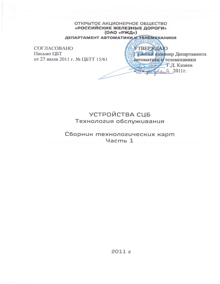 Предисловие 1 РАЗРАБОТАНА Проектно-конструкторско-технологическим бюро железнодорожной автоматики и телемеханики - филиалом открытого акционерного общества «Российские железные дороги» (ПКТБ ЦШ ОАО «РЖД») ОАО «РЖД», 2011 Воспроизведение и/или распространение настоящей технологии, а также ее применение сторонними организациями осуществляется в порядке, установленном ОАО «РЖД» II Введение В сборник технологических карт «Устройства СЦБ. Технология обслуживания» вошли технологические карты, устанавливающие порядок выполнения работ определенных Инструкцией по технической эксплуатации устройств и систем сигнализации, централизации и блокировки (СЦБ) ЦШ-720-09, утвержденной распоряжением ОАО «РЖД» от 22 октября 2009 года № 2150р. Технологические карты содержат раздел «Меры безопасности» устанавливающий требования по охране труда. Допуск к производству работ по данным технологическим картам должен быть оформлен в оперативном журнале (Журнал регистрации инструктажа по охране труда на рабочем месте). Нумерация и наименование разделов сборника соответствуют аналогичным разделам приложения 1 Инструкции ЦШ-720-09. Нумерация технологических карт выполнена в соответствии с требованиями нормативного железнодорожной автоматики технологических документов. документа и «Системы телемеханики. и устройства Порядок разработки 32 АТ.10901-НД», утвержденного Департаментом автоматики и телемеханики 19 августа 2009 года. Первые два (три) числа номера технологической карты соответствуют номеру работы по приложению 1 Инструкции ЦШ-720-09, третье (четвертое) число – порядковый номер технологической карты. Периодичность выполнения и исполнители работ устанавливаются в соответствии с требованиями Инструкции ЦШ-720-09. III Содержание Номер технологической карты / Раздел приложения 1 ЦШ-720-09 Наименование работы Страница 1 6 Приборы СЦБ…………………………………………………… 6.1.1, 6.2.1 Проверка состояния приборов и штепсельных розеток со стороны монтажа ………………………………………………. 1 6.3.1 Измерение напряжения на электролитических конденсаторах и выпрямителях дешифраторных ячеек и блоков дешифратора кодовой автоблокировки………………………………………… 7 6.4.1 Замена приборов СЦБ и другой аппаратуры…………………… 10 6.5.1 Проверка наличия ЗИП сменяемой аппаратуры на соответствие утвержденному перечню…………………………. 21 23 11 Устройства электропитания…………………………………... 11.1.1.1 Панели электропитания серий ПВ-60 и ПВР-40. Измерение не контролируемых средствами ТДМ напpяжений и токов цепей питания ………………………………………………………….. 23 11.1.1.2 Панели электропитания промежуточных станций серии ПВЭЦ. Измерение не контролируемых средствами ТДМ напряжений и токов цепей питания …………………………… 34 11.1.1.3 Панели электропитания крупных станций серии ПВ-ЭЦК. Измерение не контролируемых средствами ТДМ напряжений и токов цепей питания ………………………………………….. 62 11.1.1.4 Совмещенная питающая установка для малых и средних станций (СПУ). Измерение не контролируемых средствами ТДМ напpяжений и токов цепей питания ……………................ 90 11.1.1.5 Совмещенная питающая установка для крупных станций (СПУ ЭЦ 200). Измерение не контролируемых средствами ТДМ напряжений и токов цепей питания……………………… 96 11.1.2.1 Питающие установки серий ПВ-60 и ПВР-40. Внешний осмотр и чистка элементов питающей установки. Пров
