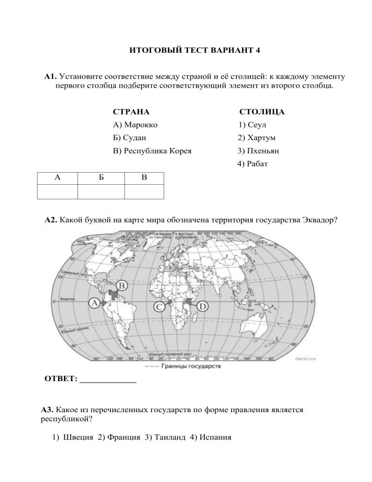 ИТОГОВЫЙ ТЕСТ ВАРИАНТ 4 А1. Установите соответствие между страной и её столицей: к каждому элементу первого столбца подберите соответствующий элемент из второго столбца. СТРАНА СТОЛИЦА А) Марокко 1) Сеул Б) Судан 2) Хартум В) Республика Корея 3) Пхеньян 4) Рабат А Б В А2. Какой буквой на карте мира обозначена территория государства Эквадор? ОТВЕТ: _____________ A3. Какое из перечисленных государств по форме правления является республикой? 1) Швеция 2) Франция 3) Таиланд 4) Испания А4. Государство Таиланд расположено ? 1) Африке 2) Азии 3) Латинской Америке 4) Океании А5.Выберите строку, где перечислены внутриконтинентальные страны Азии? 1)Бутан, Непал, Мьянма, Пакистан 2)Нигер, Эфиопия, Лесото 3)Туркменистан, Непал, Афганистан А6.Какая из перечисленных стран имеет федеративное устройство? 1)Япония 2)Китай 3)Индия 4)Индонезия А7.Какая страна расположена в Северной Африке? 1)Кения 2)Танзания 3)Тунис 4)Сомали А8.Какая из перечисленных стран относится к развивающимся странам? 1)ЮАР 2)Польша 3)Китай 4)Канада А9.К новым индустриальным странам относится? 1)Малайзия 2)Непал 3)Вьетнам 4)Иран А10.В какой из перечисленных стран ВВП на душу населения наибольший? 1)Норвегия 2)Казахстан 3)Индия 4)Нигерия А.11. С какой из перечисленных стран граничит Россия? 1)Польша 2)Словакия 3)Молдавия 4)Венгрия А12.Какая из перечисленных стран является членом ОПЕК? 1).Индия 2)Нигерия 3)Эфиопия 4)Россия А13.Форма административно-территориального устройства в Великобритании такая же, как и в 1)Чехии 2)Российской Федерации 3)Бельгии 4)Бразилии А14.Какая страна расположена в Центральной Америке? 1)Венесуэла 2)Панама 3)Перу 4)Эквадор А15.Какая из перечисленных стран является членом НАТО? 1)Аргентина 2)Норвегия 3)Сербия 4)Швейцария В1. Установите соответствие между типом страны и страной, относящейся к данному типу ТИПЫ СТРАН 1) наименее развитые 2) нефтеэкспортирующие 3) «переселенческого» типа СТРАНА А) Австралия Б) Сомали В) Катар Г) Болгария Запишите в таблицу буквы выбранных ответов. 1 2 3 В2. Выберите из предложенного списка три страны, которые в прошлом были колониями Великобритании. А) Б) В) Г) Д) Е) Индонезия Ангола Мьянма Мали Пакистан Индия Буквы, соответствующие выбранным ответам, запишите в алфавитном порядке без пропусков и знаков препинания. Ответ: _______________. В3. Как называется совокупность стоимости товаров и услуг произведенных в стране? ________________________________________________________________ В4. Объединение семи ведущих экономически развитых стран, в которое входят 1.____________________________ 2.____________________________ 3.____________________________ 4.____________________________ 5.____________________________ 6.____________________________ 7.____________________________ называется________________________________________ С1. Определите, к какой стране относится следующее описание: "Эта страна, относящаяся к странам переселенческого капитализма входит в состав Британского содружества, имеет две границы с одной и той же страной, обладает разнообразными природными ресурсами и имеет два государственных языка". ______________________________________________ С2. Определите страну по ее краткому описанию. Это государство с самой маленькой площадью территории и минимальным числом жителей, уникальное по форме правления. Здесь имеется свое правительство, банк, гвардия, законы. Сфера деятельности этого государства – весь мир. ____________________________________________ Назовите форму правления этого государства: ОТВЕТ: ___________________________________ ОТВЕТЫ А1 – 421 А2 - А А3 - 2 А4 - 2 А5 - 3 А6 - 3 А7 - 3 А8 - 3 А9 -