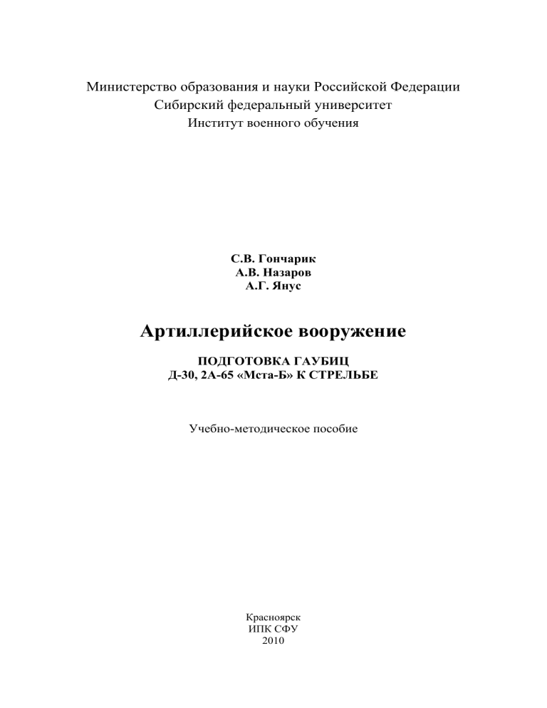 Министерство образования и науки Российской Федерации Сибирский федеральный университет Институт военного обучения С.В. Гончарик А.В. Назаров А.Г. Янус Артиллерийское вооружение ПОДГОТОВКА ГАУБИЦ Д-30, 2А-65 «Мста-Б» К СТРЕЛЬБЕ Учебно-методическое пособие Красноярск ИПК СФУ 2010 2 ББК 68.80 Г65 Гончарик, С.В. К56 Артиллерийское вооружение. Подготовка гаубиц Д-30, 2А-65 «Мста-Б» к стрельбе : учеб. пособие / С. В. Гончарик, А. В. Назаров, А. Г. Янус. – Красноярск : ИПК СФУ, 2010. – 36 с. Данное пособие написано в соответствии с учебной программой дисциплины «Артиллерийское вооружение». Изложен наиболее сложный раздел «Подготовка гаубиц к стрельбе». Рассмотрен порядок перевода гаубицы Д-30 из походного положения в боевое, осмотра и проверки работы ее механизмов. Изложены меры безопасности при эксплуатации гаубицы 2А-65 «МСТА-Б», даны ее справочные эксплуатационные характеристики, порядок осмотра и проверки основных механизмов. Предназначено для студентов, обучающихся по программам военной подготовки офицеров запаса. ББК 68.80 Артиллерийское вооружение ПОДГОТОВКА ГАУБИЦ Д-30, 2А-65 «Мста-Б» К СТРЕЛЬБЕ Учебно-методическое пособие Редактор Л. И. Вейсова Компьютерная верстка: А. Б. Филимонова Подписано в печать 19.05.2010. Печать плоская. Формат 60×84/16 Бумага офсетная. Усл. печ. л. 2,25. Тираж 50 экз. Заказ № 1817 Издательско-полиграфический комплекс Сибирского федерального университета 660041, г. Красноярск, пр. Свободный, 82а Сибирский федеральный университет, 2010 Оформление, оригинал-макет. ИПК СФУ, 2010 3 ВВЕДЕНИЕ Целевой установкой учебной дисциплины «Артиллерийское вооружение» является подготовка офицера-артиллериста, умеющего организовывать и выполнять операции технической подготовки штатных артиллерийских орудий к боевому применению, а также способного качественно осваивать новые образцы артиллерийского вооружения. Основной формой управления техническим состоянием любого комплекса вооружения является техническое обслуживание, проводимое исполнителями эксплуатации с целью поддержания комплекса вооружения в исправном (работоспособном) состоянии. Опыт ведения современных локальных боевых действий подтверждает, что правильная организация технического обслуживания все в большей степени становится активным фактором, способствующим более эффективному использованию комплексов вооружения, повышению их эксплуатационной надежности и боевой готовности. Постоянная высокая боевая готовность войск обеспечивается высокими морально-деловыми качествами личного состава, высоким уровнем боевой и, прежде всего, полевой выучки войск, научной организацией использования, обслуживания и применения вооружения и техники. Современное насыщение войск новыми и разнообразными образцами боевой техники и вооружения требует высокой организации правильной ее эксплуатации. Организация эксплуатации вооружения и техники является важнейшей составной частью технического обеспечения войск. От уровня организации эксплуатации зависит работа образцов вооружения без повреждений, их техническая исправность и боеготовность. Установленные требования приказов, наставлений и руководств являются важнейшим условием поддержания техники в исправном состоянии и постоянной готовности к боевому применению. За правильное использование, обслуживание и хранение образцов вооружения о