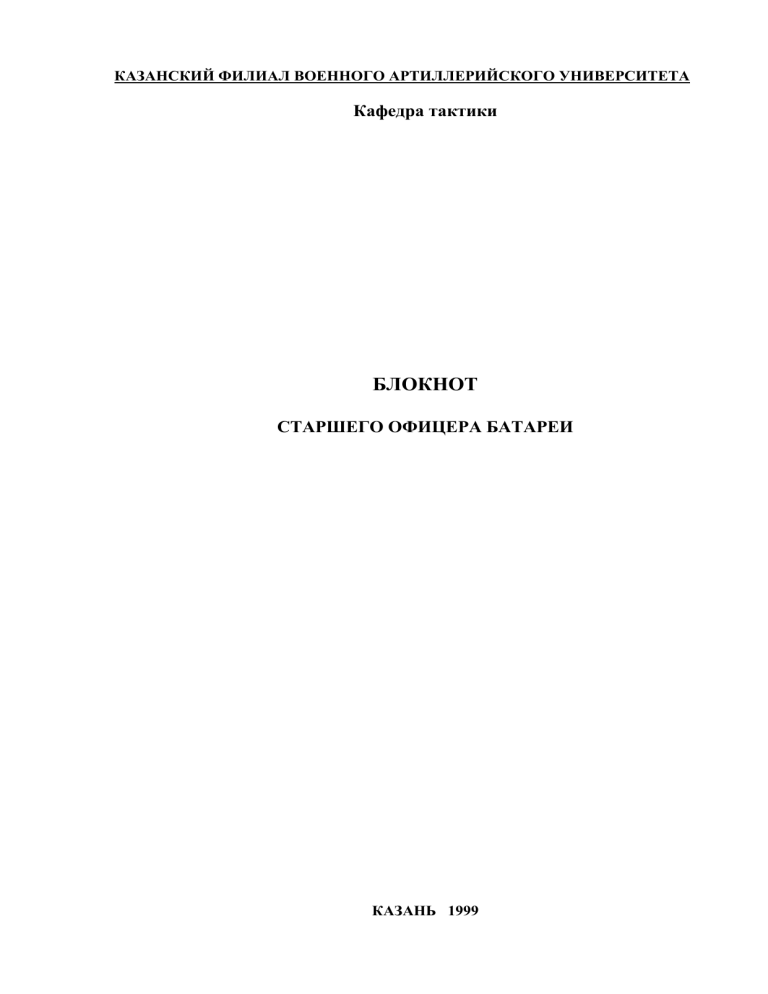 КАЗАНСКИЙ ФИЛИАЛ ВОЕННОГО АРТИЛЛЕРИЙСКОГО УНИВЕРСИТЕТА Кафедра тактики БЛОКНОТ СТАРШЕГО ОФИЦЕРА БАТАРЕИ КАЗАНЬ 1999 Блокнот старшего офицера батареи наземной артиллерии разработан на основе Боевого устава СВ, ч. II, ч. III, Боевого устава артиллерии СВ, ч. II и Руководства по боевой работе огневых подразделений артиллерии. Он представляет собой набор бланков, таблиц и справочных материалов, необходимых для работы на огневой позиции, а также форм приказов и распоряжений старшего офицера батареи . Блокнот разработан на кафедре тактики кандидатом военных наук, доцентом полковником ЕГОРОВЫМ В.М., кандидатами военных наук полковниками МУХАМЕТГАТОВЫМ Р.Х., ТУРКИНЫМ В.А., кандидатом военных наук, доцентом КОШЕЛЕВЫМ В.В., полковником ДЕРЮГИНЫМ Б.В. Ответственный за выпуск полковник ЕГОРОВ В.М. ОГЛАВЛЕНИЕ I. ОБЩИЕ ПОЛОЖЕНИЯ …………………………………………… 1.1. Обязанности старшего офицера батареи …………………. 1.2. Основы боевых действия артиллерийских подразделений. 1.3. Оборона ……………………………………………………… 1.4. Наступление …………………………………………………. 1.5. Передвижение артиллерийских подразделений ………….. 1.6. Расположение подразделений на месте …………………… 1.7. Документы, ведущиеся на огневой позиции ……………… 1.8. Сведения о боевом и численном составе огневых взводов …………………………………………………………………... 1.9. Сведения о боеприпасах ……………………………………. 1.10. Сведения об орудиях ……………………………………… 1.11. Сведения о машине СОБ …………………………………… 1.12. Сведения о тягачах …………………………………………. 1.13. Сведения о приборах ……………………………………….. 1.14. Сведения о поправках буссоли ……………………………. 1.15. Координаты контурных точек и ориентирные направления ……………………………………………………………... 1.16. Сведения о боевом порядке ………………………………… 1.17. Позывные узлов связи, станций и должностных лиц …….. 1.18. Сигналы ……………………………………………………… II. РАБОТА СТАРШЕГО ОФИЦЕРА БАТАРЕИ (когв) ПРИ ПОДГОТОВКЕ И В ХОДЕ СОВЕРШЕНИЯ МАРША ……………………. III. РАБОТА СТАРШЕГО ОФИЦЕРА БАТАРЕИ (когв) ПРИ ОРГАНИЗАЦИИ И ВЕДЕНИИ БОЕВЫХ ДЕЙСТВИЙ …………………… 3.1. Уяснение полученной задачи и оценка обстановки ……… 3.2. Распоряжение СОБ на подготовку огв к выполнению боевой задачи …………………………………………………………… 3.3. Получение задачи на выход РГ ……………………………. 3.4. Работа начальника РГ по выбору и подготовке ОП к занятию огневыми взводами …………………………………………... 3.5. Распоряжение СОБ на выдвижение в район ОП …………. 3.6. Работа СОБ при занятии подготовленной закрытой огневой позиции ………………………………………………………. 3.7. Работа СОБ при занятии неподготовленной закрытой ОП 6 6 8 9 9 10 11 11 13 14 14 15 15 15 15 16 17 20 20 22 33 33 35 36 37 41 42 с предварительной разведкой …………………………………………. 3.8. Боевой приказ старшего офицера батареи в обороне (вариант) ………………………………………………………………… 3.9. Боевой приказ старшего офицера батареи в наступлении (вариант) ………………………………………………………………… 3.10. Карточка топогеодезической привязки ОП ……………….. 3.11. Таблица исчисленных установок для стрельбы батареей ... 3.12. Карточка огневого вала батареи …………………………… 3.13. Карточка последовательного сосредоточения огня батареи …………………………………………………………………... 3.14. Таблица наличия и расхода боеприпасов на огневой позиции ………………………………………………………………….. 3.15. 