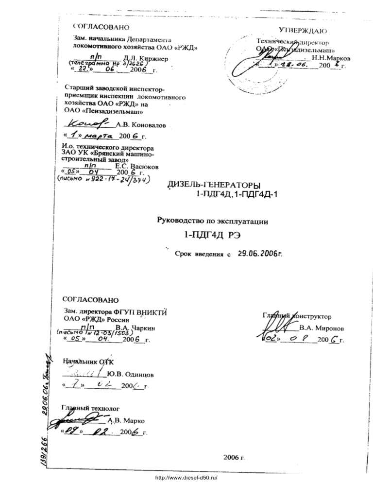 http://www.diesel-d50.ru/ Введение………………………………………………………………………………… 6 1 Техническое описание……………………………………………………………….. 6 1.1 Назначение………………………………………………………………………….. 6 1.2 Технические данные……………………………………………………………….. 10 1.3 Устройство и работа дизель - генератора………………………………………… 13 1.3.1 Устройство дизель - генератора………………………………………………… 13 1.3.2 Общее устройство дизеля……………………………………………………….. 15 1.3.3 Устройство и работа узлов дизеля и его систем ………………………………. 15 1.3.3.1 Рама дизеля ……………………………………………………………………. 15 1.3.3.2 Подшипники коленчатого вала ………………………………………………. 18 1.3.3.3 Блок цилиндров ………………………………………………………………… 19 1.3.3.4 Втулка цилиндра ……………………………………………………………….. 21 1.3.3.5 Подшипники распределительного вала ………………………………………. 22 1.3.3.6 Крышка цилиндра ……………………………………………………………… 22 1.3.3.7 Вал коленчатый ………………………………………………………………… 24 1.3.3.8 Шатун …………………………………………………………………………… 25 1.3.3.9 Поршень ………………………………………………………………………… 26 1.3.3.10 Клапаны впускной и выпускной …………………………………………….. 28 1.3.3.11 Привод клапанов ……………………………………………………………… 29 1.3.3.12 Вал распределительный ………………………………………………………. 33 1.3.3.13 Привод распределительного вала и топливного насоса …………... ………. 34 1.3.3.14 Турбокомпрессор …………………………………………………………….. 37 1.3.3.15 Коллектор наддувочный …………………………………………………….. 39 1.3.3.16 Охладитель наддувочного воздуха …………………………………………. 39 1.3.3.17 Коллекторы выхлопные………………………………………………………. 40 1.3.3.18 Топливная система …………………………………………………………… 42 1.3.3.19 Насос топливный …………………………………………………………….. 43 1.3.3.20 Форсунка …………………………………………………………………….. 49 1.3.3.21 Фильтр топливный……………………………………………………………. 50 1.3.3.22 Система смазки ……………………………………………………………….. 53 Подп. и дата Взам. инв. № Инв. № дубл. Подп. и дата Содержание 1-ПДГ4Д РЭ Изм. Лист Проверил Бакушкина Зайцева Н. контр. Антошина Разработал Инв. № подл. № докум. Утв. Подпись Дата Дизель – генераторы 1-ПДГ4Д, А 1-ПДГ4Д-1 Руководство по эксплуатации http://www.diesel-d50.ru/ Лит. Лист Листов 2 217 ОАО «Пензадизельмаш» Подп. и дата 1.3.3.23 Насос масляный ………………………………………………………………. 54 1.3.3.24 Маслоочиститель центробежный ……………………………………………. 56 1.3.3.25 Фильтр грубой очистки масла ……………………………………………….. 57 1.3.3.26 Привод насосов ………………………………………………………………. 58 1.3.3.27 Механизм валоповоротный ………………………………………………….. 59 1.3.3.28 Система охлаждения …………………………………………………………. 61 1.3.3.29 Насосы водяные……………………………………………………………….. 63 1.3.3.30 Коллектор водяной …………………………………………………………… 64 1.3.3.31 Система пуска…………………………………………………………………. 64 1.3.3.32 Электронный регулятор частоты вращения и мощности …………………. 64 1.3.3.33 Управление дизель – генератором……………………………………………. 66 1.3.3.34 Рычажный механизм управления топливными насосами………………….. 67 1.3.3.35 Аварийно-предупредительные устройства и системы……………………… 68 2 Инструкция по эксплуатации……………………………………………………… 73 2.1 Общие указания……………………………………………………………………. 73 2.1.1 Требования к обслуживающему персоналу…………