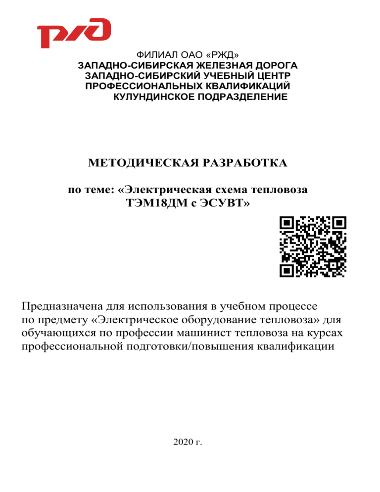 ФИЛИАЛ ОАО «РЖД» ЗАПАДНО-СИБИРСКАЯ ЖЕЛЕЗНАЯ ДОРОГА ЗАПАДНО-СИБИРСКИЙ УЧЕБНЫЙ ЦЕНТР ПРОФЕССИОНАЛЬНЫХ КВАЛИФИКАЦИЙ КУЛУНДИНСКОЕ ПОДРАЗДЕЛЕНИЕ МЕТОДИЧЕСКАЯ РАЗРАБОТКА по теме: «Электрическая схема тепловоза ТЭМ18ДМ с ЭСУВТ» Предназначена для использования в учебном процессе по предмету «Электрическое оборудование тепловоза» для обучающихся по профессии машинист тепловоза на курсах профессиональной подготовки/повышения квалификации 2020 г. Авторы: Пуликов Петр Владимирович Преподаватель (в системе специального образования) высшей категории _________ (подпись) Свидерский В.О. Преподаватель (в системе специального образования) категории _________ (подпись) 2 Кулундинское подразделение Зап-Сиб УЦПК Пуликов П.В. Содержание Назначение реле и контакторов Расположение клеммных реек на тепловозе ТЭМ18 Питание цепей управления и освещения Пуск дизеля Возбуждение синхронного возбудителя и подзарядка аккумуляторной батареи Выбор пульта управления Работа схемы при движении тепловоза Возбуждение тягового генератора Силовая цепь Управление ослаблением возбуждения тяговых электродвигателей Управление вентилятором и жалюзи холодильной камеры Работа схемы по системе двух единиц Включение прожекторов Контроль сопротивления изоляции низковольтной цепи Защита тягового генератора по максимальному току Защита дизеля от снижения давления масла Защита генератора от замыкания на корпус Защита от трогания тепловоза на позиции выше первой Защита от перегрева воды и масла дизеля Ослабление искрения поездных контакторов Отключение цепи с неисправным тяговым электродвигателем Ослабление искрения шунтировочных контактов Электростеклоочистители Защита от запуска дизеля при зарядке аккумуляторной батареи Работа гребнесмазывателя Защита от боксования Электрический реостатный тормоз Включение, режимы и особенности работы электрического тормоза Возможные неисправности в работе тепловоза, их причины и методы устранения Пуликов П.В. Кулундинское подразделение Зап-Сиб УЦПК 4 10 10 11 14 16 16 18 19 20 21 21 23 23 23 24 24 25 25 25 25 25 25 26 26 26 26 26 30 3 РЕЛЕ и КОНТАКТОРЫ с.к подключает обмотку возбуждения ВСТ к + АБ или ВВ Электромагнитный +150А МУВ при аварийном возбуждении контактор типа МК1-10 Д1 Электромагнитный контактор типа МК6-20 с.к- подключает якорь тягового генератора к АБ. с.к -подключает пусковую обмотку возбуждения тягового генератора к АБ. 1н.з.к между проводами 183 и 1734 не позволяет включиться контактору КВ при замкнутых силовых контактах контактора Д1, предохраняя тем самым аккумуляторную батарею и низковольтные цепи тепловоза от высокого напряжения тягового генератора. 1н.р.к между проводами 575 и 133, 111 обеспечивает питание катушки реле РЭР во время пуска дизеля. 1н.з.к между проводами 111 и 112 обеспечивает по окончании пуска включение контактора КУ17. с.к- подключает удерживающую катушку реле РЗ и подает + на клеммы 1/8 и 1/1, 1/2, 1/3, 1/4, 1/5, 1/6, 1/7 КБУ Электромагнитный контактор типа МК1-10 с.к подключает обмотку возбуждения тягового КВ Электромагнитный генератора к +200А МУВ контактор типа МК1-10 1н.з.к между проводами 425 и 337 не позволяет пустить дизель (или провернуть коленчатый вал без пуска) в случае приваривания силовых контактов контактора КВ. 1н.р.к между проводами 2844, 181 и 189, до 2-й позиции создает цепь питания катушек контактора КВ и реле РКВ, обеспечивая сбор схемы тяги 