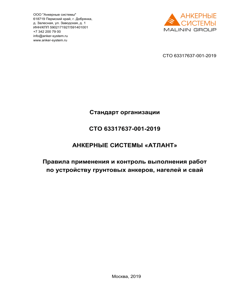 ООО "Анкерные системы" 618719 Пермский край, г. Добрянка, д. Залесная, ул. Заводская, д. 1 ИНН/КПП 5902171927/591401001 +7 342 200 79 00 info@anker-system.ru www.anker-system.ru СТО 63317637-001-2019 Стандарт организации СТО 63317637-001-2019 АНКЕРНЫЕ СИСТЕМЫ «АТЛАНТ» Правила применения и контроль выполнения работ по устройству грунтовых анкеров, нагелей и свай Москва, 2019 СТО 63317637-001-2019 СОГЛАСОВАНО: Директор филиала АО ЦНИИС «НИЦ «Тоннели и метрополитены» УТВЕРЖДАЮ: Директор ООО «Анкерные системы» _________________И. М. Малый «_____»__________2019 г. _________________Д. А. Малинин «_____»__________2019 г. СТАНДАРТ ОРГАНИЗАЦИИ СТО 63317637-00-2019 АНКЕРНЫЕ СИСТЕМЫ «АТЛАНТ» Разработчики: От филиала АО ЦНИИС НИЦ «Тоннели и метрополитены» От ООО «Анкерные системы» Зав. сектором ____________________А. А. Шевченко Технический директор _________________ А.Г. Малинин Зав. отделом разработки научно-технической документации ____________________ А.С. Газизова Науч. сотрудник ____________________А. О. Боев Москва, 2019 Страница 2/69 СТО 63317637-001-2019 Предисловие 1. РАЗРАБОТАН Филиалом АО ЦНИИС «НИЦ «Тоннели и метрополитены» (Малый И.М., Шевченко А.А., Боев А.О., Кобецкий А.Д., Полысаева А.И.), ООО «Анкерные системы» (Малинин А.Г., Малинин Д.А., Салмин И.А., Ларичев И.Н., Газизова А.С.). 2. ПРИНЯТ И ВВЕДЕН В ДЕЙСТВИЕ распоряжением ООО «Анкерные системы» №129 от 20 мая 2019. 3. ВВЕДЕН впервые. 4. Разработка стандартов организаций предусмотрена Федеральным законом №184-ФЗ «О техническом регулировании» и ГОСТ Р 1.4-2004. Стандартизация в Российской Федерации. Стандарты организаций. Общие положения. 5. Настоящий Стандарт ООО «Анкерные системы» не может быть полностью или частично воспроизведен, тиражирован и распространен без разрешения ООО «Анкерные системы» и разработчика – филиала АО ЦНИИС «НИЦ «Тоннели и метрополитены». 6. В случае несанкционированного использования настоящего Стандарта ООО «Анкерные системы» третьей организацией, для виновных наступает ответственность в соответствии с законом РФ «Об авторском праве» № 5351-1 от 9 июля 1993 г. Распространение настоящего стандарта осуществляется в соответствии с действующим законодательством и с соблюдением правил, установленных ООО «Анкерные системы». Страница 3/69 СТО 63317637-001-2019 Оглавление Введение ....................................................................................................................... 6 1. Область применения .............................................................................................. 7 2. Нормативные ссылки ............................................................................................. 7 3. Термины и определения ........................................................................................ 9 4. Общие положения ................................................................................................. 10 5. Конструктивно-технологические решения ........................................................ 11 5.1. Общие положения ............................................................................................. 11 5.2. Требования к материалам ................................................................................ 15 5.3. Антикоррозионная защита................................................................................ 17 5.4. Центраторы ....................................................................................................... 18 6. Основные указания по проектированию .......................................................... 19 6.1. Исходные данные ............................................................................................. 19 6.2. Состав проекта .................................................................................................. 20 6.3. Рекомендации к параметрам ограждения котлована..................................... 21 6.4. Несущая способность ....................................................................................... 22 6.5. Рекомендации по проектированию свай ......................................................... 23 7. Производ