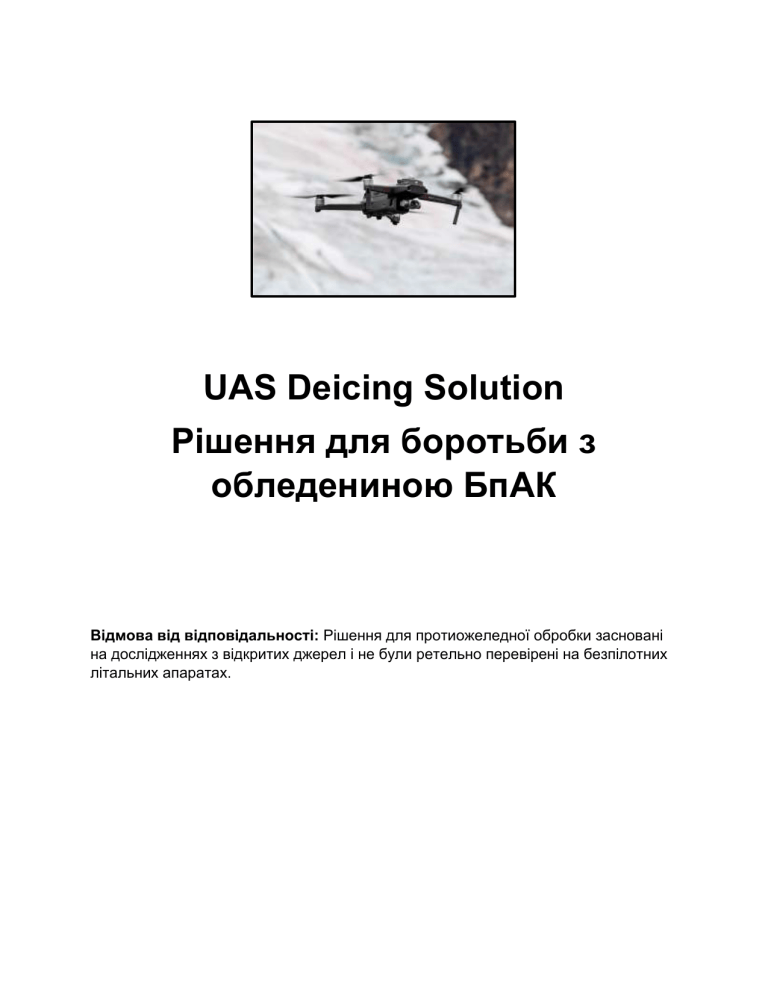 UAS Deicing Solution Рішення для боротьби з обледениною БпАК Відмова від відповідальності: Рішення для протиожеледної обробки засновані на дослідженнях з відкритих джерел і не були ретельно перевірені на безпілотних літальних апаратах. I. Вимірювання a. ЧАШКА: 1 ЧАШКА = 236,58 мл/8 унцій (півпляшки води/пива) b. РІДКА УНЦІЯ: 1 РІДКА УНЦІЯ = 29,57 мл/2 мл (одна порція лікеру) c. Чайна ложка: = 5 мл/ (одна повна кришка пляшки з водою/верхня частина) СОПи: Стандартні практики використання БПЛА в холодну погоду. II. СОПи: Стандартні практики використання БПЛА в холодну погоду. a. Рекомендуйте надягати медичні рукавички під час підготовки будь-якого пластику, стрічок, клею чи інших матеріалів, які можуть залишити ДНК або відбитки пальців на БПЛА. b. Зберігайте батареї в ізольованому контейнері, наприклад, невеликому холодильнику. Помістіть одноразові грілки для рук, нагріті пакети з сухим рисом, нагріте каміння або щось, що підвищить і підтримуватиме підвищену температуру, всередину кулера. c. Перед підготовкою переконайтеся, що БПЛА має зовнішню температуру. Зберігайте БПЛА в захисному боксі на верхній частині транспортного засобу, щоб БПЛА залишався холодним. Якщо БПЛА теплий, а потім розміщений на вулиці, буде мороз. d. Підключіть теплу батарею до БПЛА, покладіть одноразову грілку для рук над батарейним відсіком. ПРИМІТКИ: Щоб компенсувати вагу пластику та грілки для рук, подумайте про те, щоб зняти кришку батарейного відсіку для польоту.* e. БПЛА, які мають відкриті частини фюзеляжу, оберніть фюзеляж БПЛА пластиком, гумою або будь-яким легким матеріалом, щоб запобігти проникненню протиожеледного розчину в чутливі компоненти. Обов'язково включіть обгортку батарейного відсіку. Використовуйте якомога меншу кількість матеріалу. f. Нанесіть чистий ізопропіловий спирт на чисту ганчірку. Протріть ротори/пропелери та зовнішню частину БПЛА, щоб видалити будь-який бруд або речовини, які можуть перешкоджати прилипанню протиожеледного розчину. g. Після того, як весь БПЛА висохне, нанесіть протиожеледний розчин під час ініціалізації БПЛА та підготовки до польоту. Нанесіть другий шар протиожеледного розчину безпосередньо перед запуском.**, *** h. Для планування польоту використовуйте Icing Chart для визначення максимальної висоти польоту, щоб запобігти надмірному обмерзанню під час тривалого польоту III. Рішення для боротьби з ожеледицею: Оператори повинні розглянути можливість перебування на відповідній висоті та швидкості, щоб зменшити накопичення льоду та непотрібне споживання енергії. Не доведено, що ці рішення запобігають обмерзанню на БПЛА та не спричиняють надмірної корозії на багаторазових БПЛА. 1. “JUICE”: “Cік” a. 85% етиленгліколь (радіаторна рідина) b. 10% Вода c. 5% ізопропіловий спирт d. дві чайні ложки засобу для миття посуду на одну склянку розчину 2. “POKRASA”: a. Дві (2) частини ізопропілового спирту b. Одна (1) частина води c. 2 чайні ложки засобу для миття посуду на кожні дві склянки рідини * Зняття кришки батарейного відсіку не перевірялося, щоб переконатися в ефективності, зберігаючи тепло батареї під час польоту. ** Використання етиленгліколю може зрештою спричинити корозію певних компонентів. *** Для багаторазових БПЛА рекомендую запобігати потраплянню розчину в двигуни. Замочіть пропелери розчином безпосередньо перед польотом. Обприскати фюзеляж, включаючи камеру