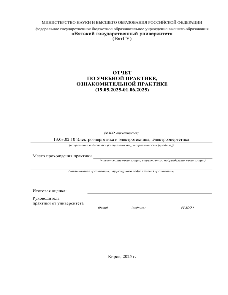ОТЧЕТ ПО УЧЕБНОЙ ПРАКТИКЕ, ОЗНАКОМИТЕЛЬНОЙ ПРАКТИКЕ (19.05.2025-01.06.2025) (Ф.И.О. обучающегося) 13.03.02.10 Электроэнергетика и электротехника, Электроэнергетика (направление подготовки (специальность), направленность (профиль)) Место прохождения практики (наименование организации, структурного подразделения организации) (наименование организации, структурного подразделения организации) Итоговая оценка: Руководитель практики от университета (дата) (подпись) Киров, 2025 г. (Ф.И.О.) Содержание Введение .....................................................................................................................................3 1 Мазутное хозяйство ТЭС ......................................................................................................4 1.1 Общая характеристика мазута как топлива ..........Ошибка! Закладка не определена. 1.2 Типы и технологические схемы мазутного хозяйства ...................................................16 1.3 Краткое описание основного оборудования мазутного хозяйства ...............................20 1.3.1 Сливные устройства .......................................................................................................20 1.3.2 Оборудование для хранения мазута .............................................................................22 1.3.3 Мазутные насосы ............................................................................................................24 1.3.4 Подогреватели мазута ....................................................................................................25 1.3.5 Газомазутные горелки ....................................................................................................26 1.4 Требования к мазутному хозяйству ТЭС ........................................................................28 Заключение...............................................................................................................................30 Приложение А (справочное) Библиографический список ..................................................31 Изм. Лист Разраб. Проверил Консульт. Н.контр. Утвердил № докум. Подпись Дата Отчёт по учебной практике, ознакомительной практике Лит. Лист 2 Листов 20 ВятГУ, кафедра ЭС, группа Введение Мазутное хозяйство тепловых электростанций — это сложный комплекс сооружений, оборудования и технологических процессов, предназначенный для приёма, хранения, подготовки и подачи мазута в котельные агрегаты. Выступая в качестве резервного или аварийного топлива, мазут играет ключевую роль в обеспечении гарантированной и надёжной работы ТЭС, особенно в периоды пиковых нагрузок, во время плановых ремонтов основного оборудования или при возникновении проблем с основным топливом, таким как природный газ или уголь. Бесперебойная и экономичная работа мазутного хозяйства является важным фактором, определяющим стабильность энергоснабжения потребителей. Эффективная организация процессов приема, хранения и подготовки мазута позволяет минимизировать потери топлива, поддерживать оптимальные параметры его подачи в котельные агрегаты и снижать негативное воздействие на окружающую среду. В рамках учебной практики будут рассмотрены основные аспекты функционирова- Инв. № подл. Подпись и дата Взам. инв. № Инв. № дубл. Подпись и дата ния мазутного хозяйства ТЭС. Лист Изм. Лист № докум. Подпись Дата 3 1 Тепловая схема ТЭЦ 1.1 Определение, назначение и виды тепловых схем Теплоэлектроцентраль (ТЭЦ) предназначена для обеспечения теплом и электрической энергией технологических процессов предприятия и жилого района. Тепловой схемой называется условное обозначение взаимного расположения агрегатов и аппаратов электростанции, участвующих в технологическом процессе выработки электроэнергии и теплоты. Она определяет основное содержание тех