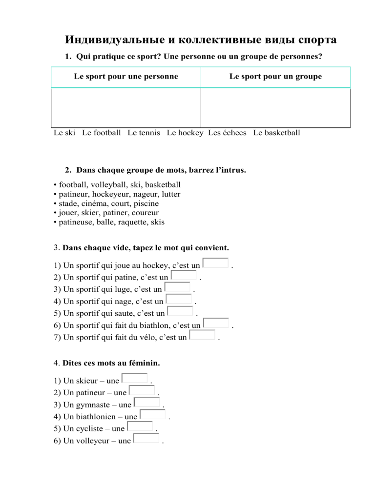 Индивидуальные и коллективные виды спорта 1. Qui pratique ce sport? Une personne ou un groupe de personnes? Le sport pour une personne Le sport pour un groupe Le ski Le football Le tennis Le hockey Les échecs Le basketball 2. Dans chaque groupe de mots, barrez l’intrus. • football, volleyball, ski, basketball • patineur, hockeyeur, nageur, lutter • stade, cinéma, court, piscine • jouer, skier, patiner, coureur • patineuse, balle, raquette, skis 3. Dans chaque vide, tapez le mot qui convient. 1) Un sportif qui joue au hockey, c’est un 2) Un sportif qui patine, c’est un . 3) Un sportif qui luge, c’est un . 4) Un sportif qui nage, c’est un . 5) Un sportif qui saute, c’est un . 6) Un sportif qui fait du biathlon, c’est un 7) Un sportif qui fait du vélo, c’est un 4. Dites ces mots au féminin. 1) Un skieur – une 2) Un patineur – une 3) Un gymnaste – une 4) Un biathlonien – une 5) Un cycliste – une 6) Un volleyeur – une . . . . . . . . . 5. Reliez chaque texte à la définition correcte. - C'est un sport combinant deux disciplines: le ski de fond et le tir à la carabine. - C'est un sport d’équipe se jouant sur une patinoire spécialement aménagée. - C'est un sport olympique qui se pratique en piscine, en eau libre (lac, mer). - C'est un sport de raquette qui oppose soit deux joueurs, soit quatre joueurs sur le court. - C'est un sport collectif qui se joue principalement au pied avec un ballon sphérique. La natation Le biathlon Le tennis Le football Le hockey 6. Faites des phrases en mettant les mots en ordre. cour dans la gymnastique matin . la de fait Chaque il la . adore Elle à piscine souvent va et natation la . patineur bon faut il un devenir Pour ferme travailler pratique le dans . ville Je sportif club karaté de notre un 7. Trouvez les mots corrects pour chaque catégorie. Les sportifs qui choisissent un sport individuels Les sportifs qui choisissent un sport d'équipe les volleyeurs les basketteurs les footballeurs les patineurs les skieurs les cyclistes les gymnastes les hockeyeurs les handballeurs les nageurs